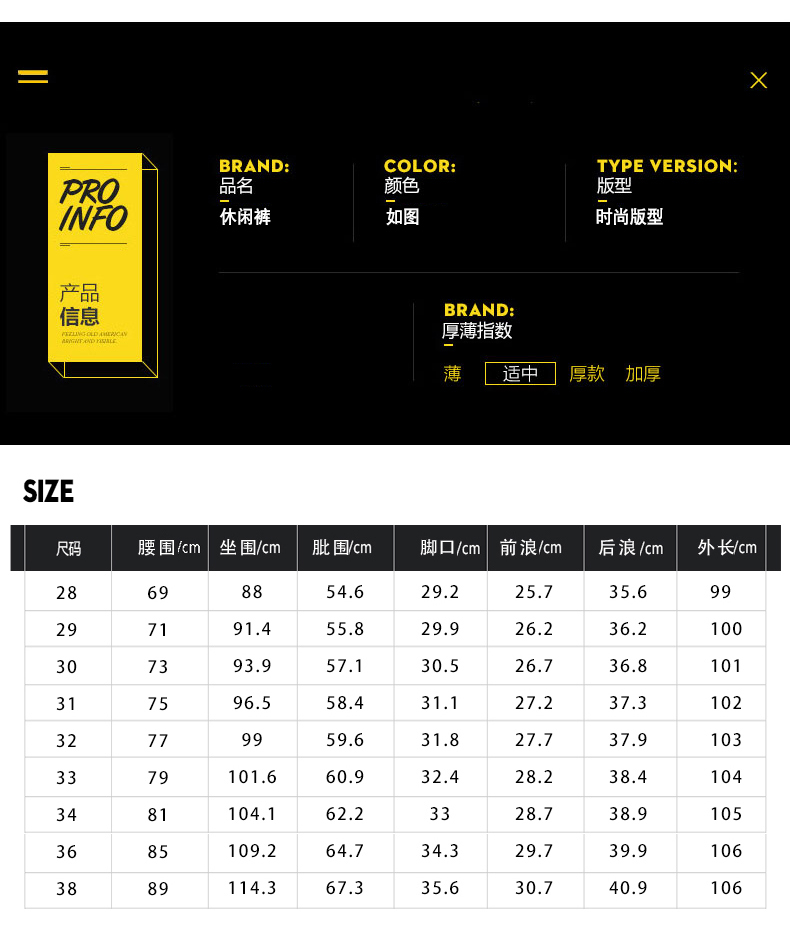 尺码 28 29 30 31 32 33 34 36 38