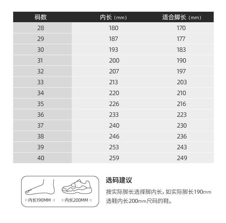 尺码 28码内长17.8厘米 29码内长18.5厘米 30码内长19.2厘米 31码内长19.9厘米 32码内长20.6厘米 33码内长21.2厘米 34码内长21.9厘米 35码内长22.6厘米 36码内长23.2厘米 37码内长23.9厘米 38码内长24.6厘米 39码内长25.2厘米 40码内长25.9厘米