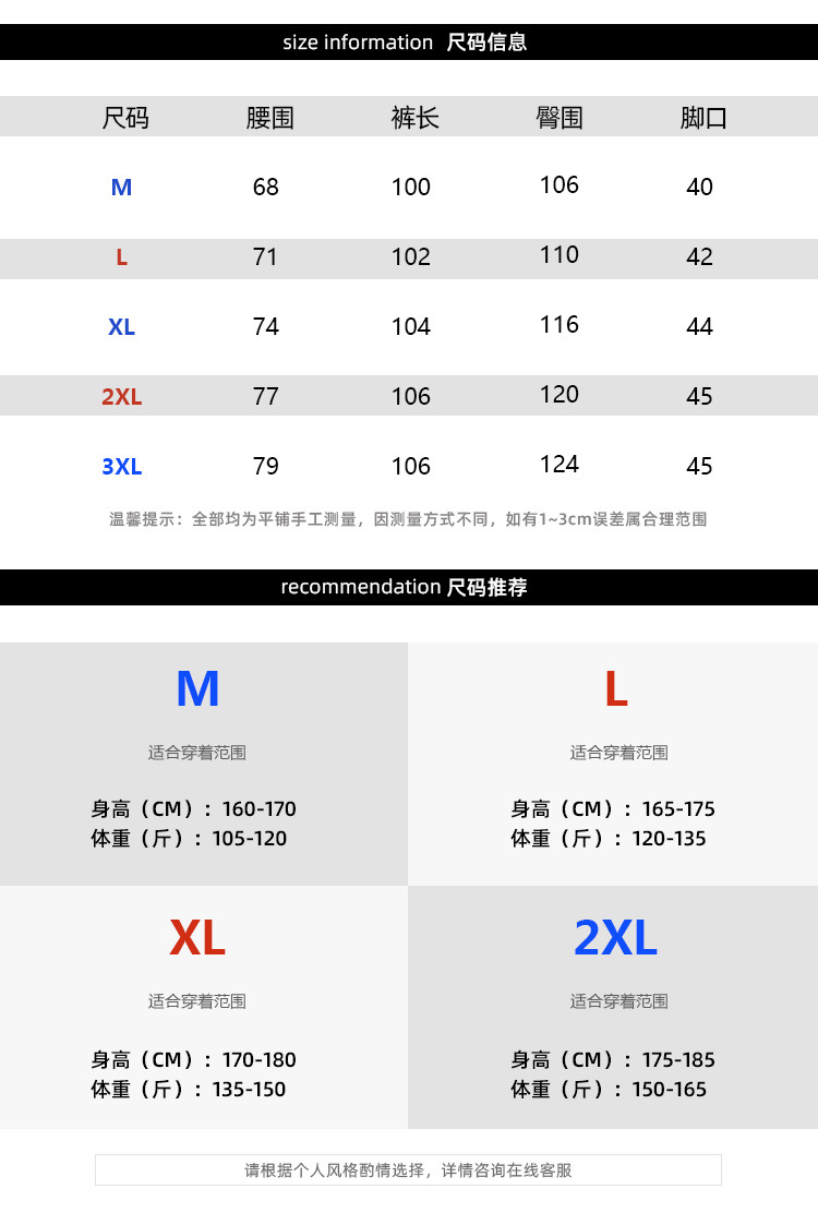 尺码 2XL 3XL L M XL