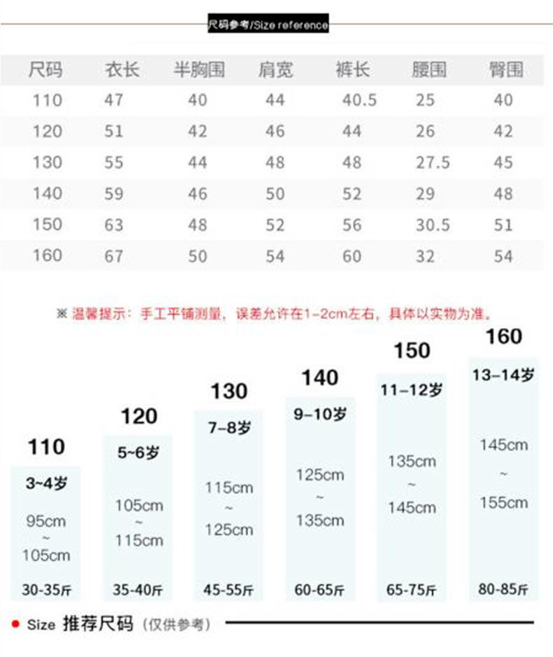 尺码 120码建议身高105_115cm 130码建议身高115_125cm 140码建议身高125_135cm 150码建议身高135_145cm 160码建议身高145_155cm