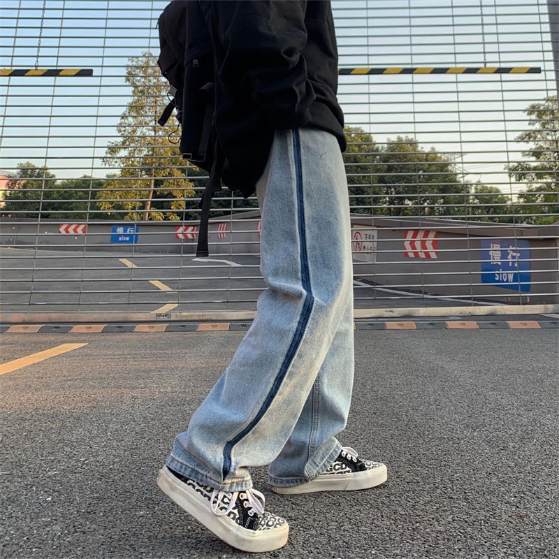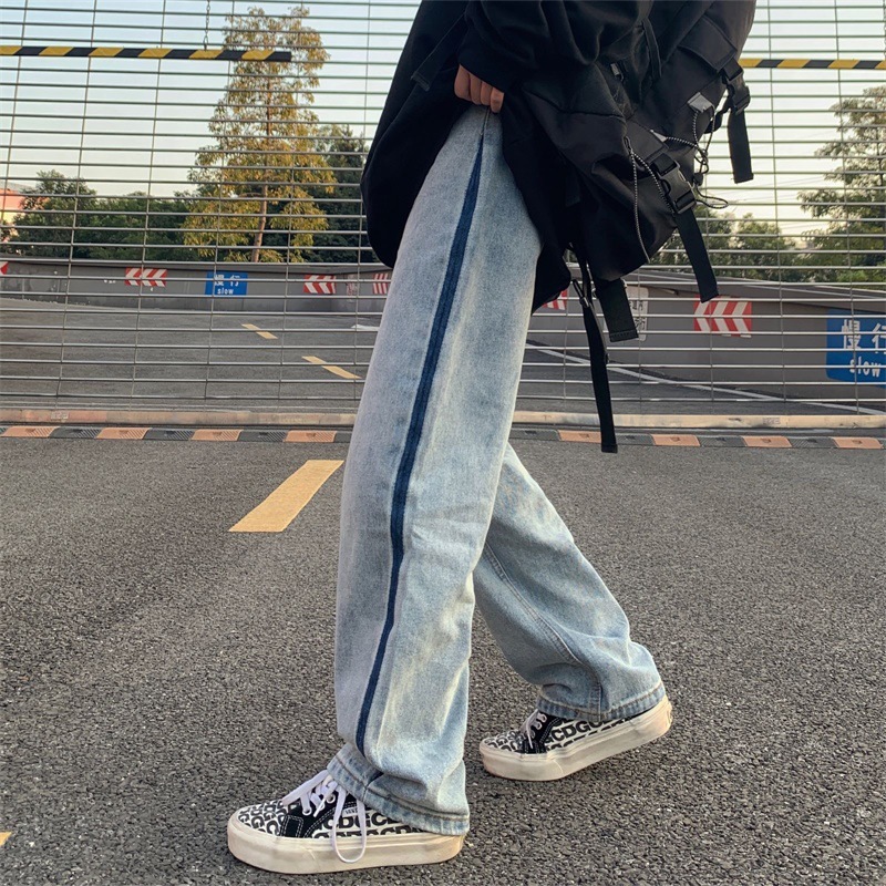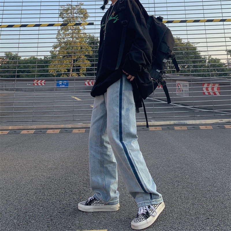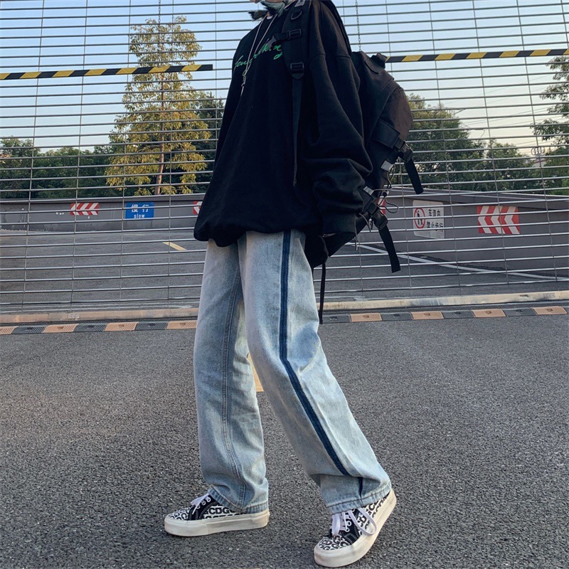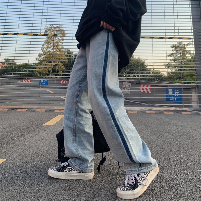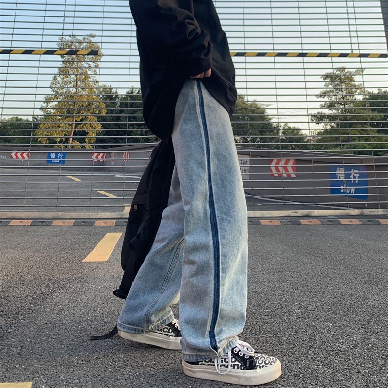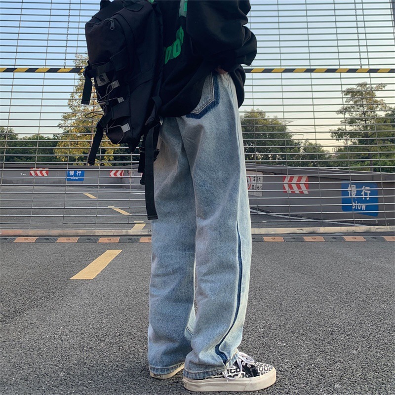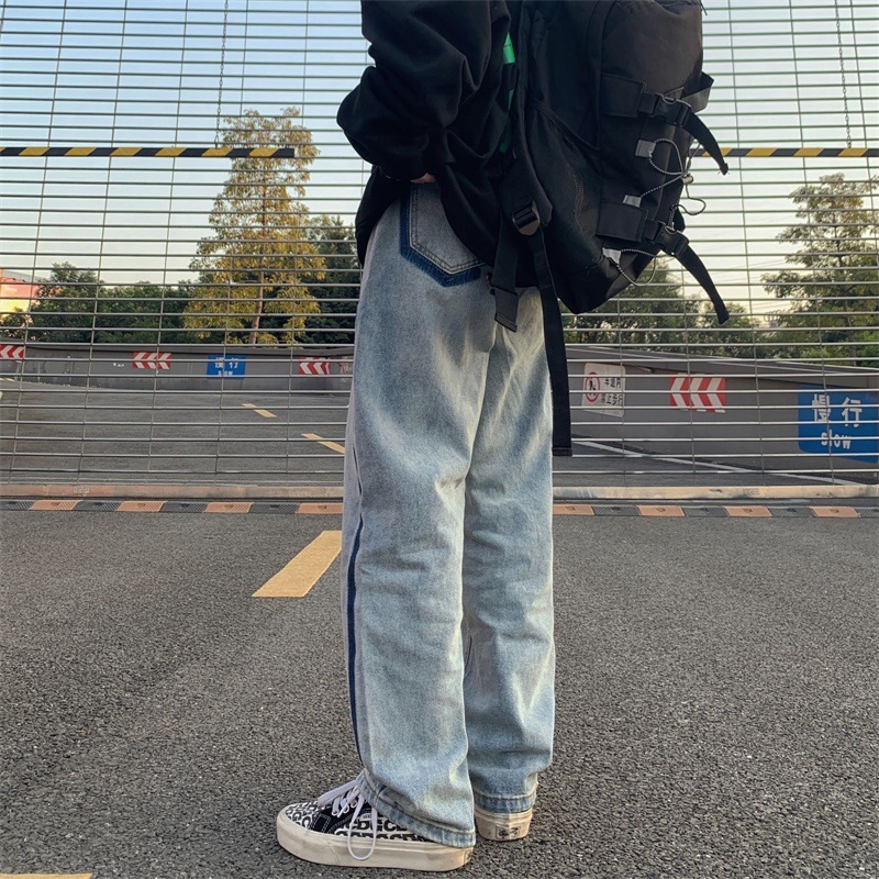 潮流ins韩版复古撞色拉边线水洗直筒牛仔裤长裤男女潮