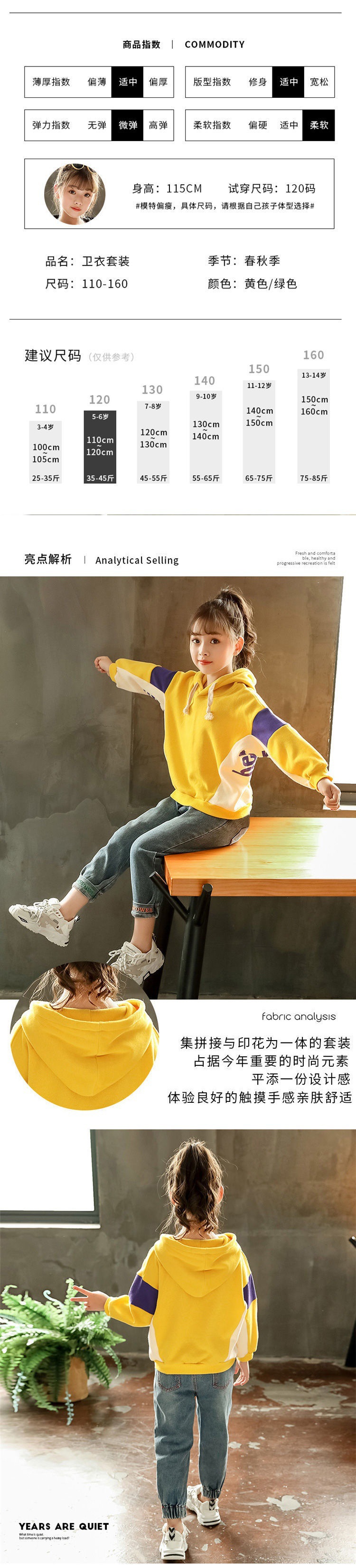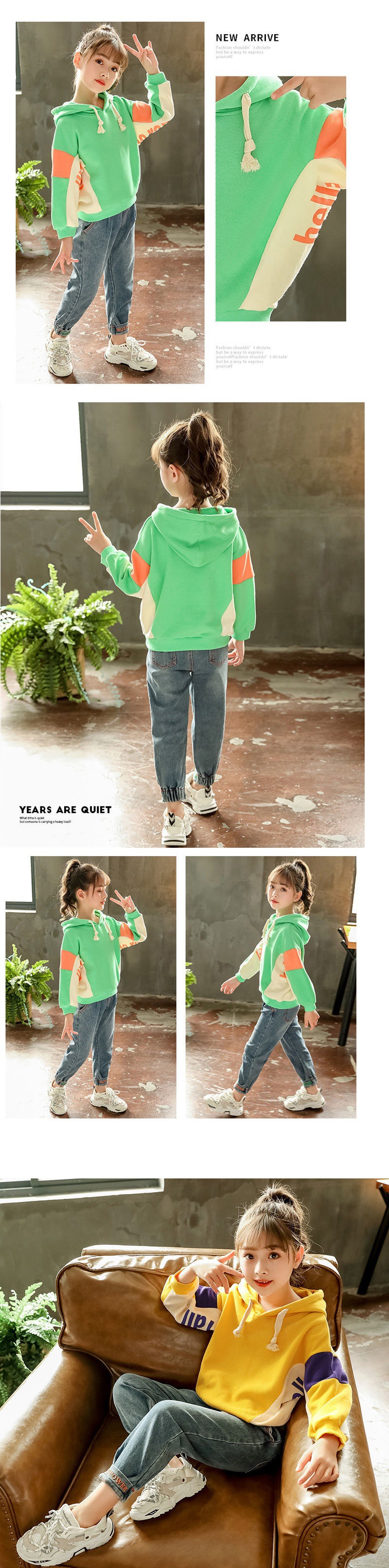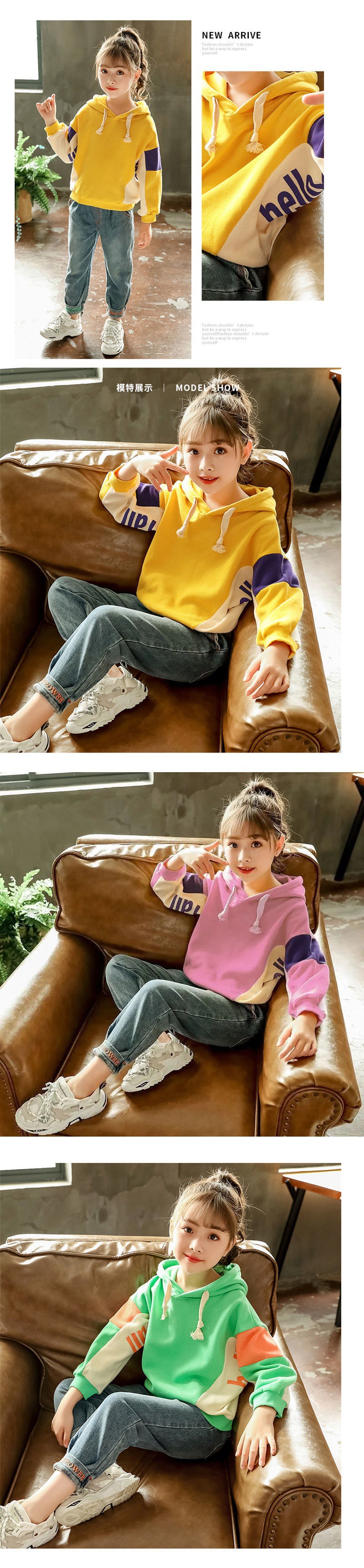 颜色 黄色撞色卫衣+绣花牛仔裤 粉红色撞色卫衣+绣花牛仔裤 绿色撞色卫衣+绣花牛仔裤 黄色_撞色卫衣(单上衣) 粉红色_撞色卫衣(单上衣) 绿色_撞色卫衣(单上衣)