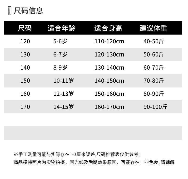 尺码 120 130 140 150 160 170