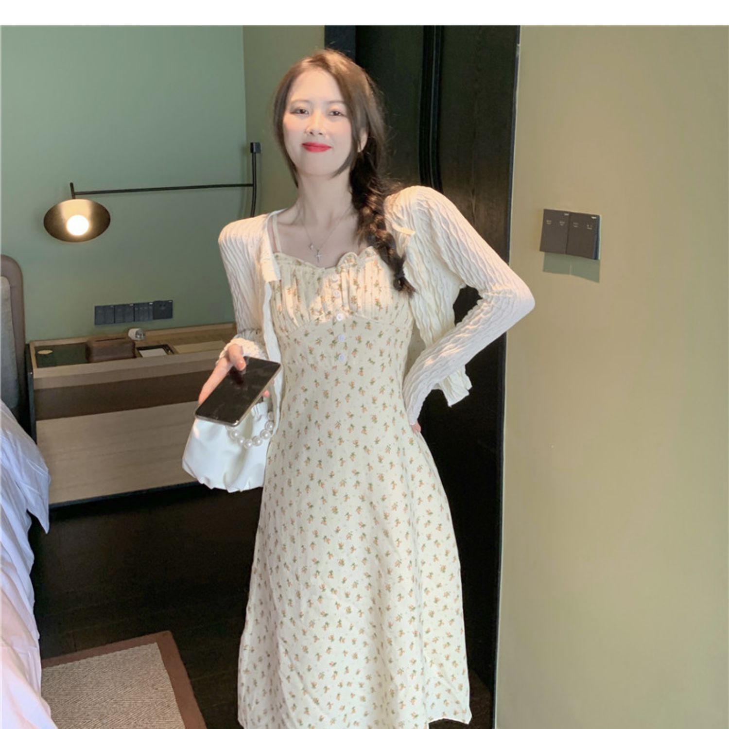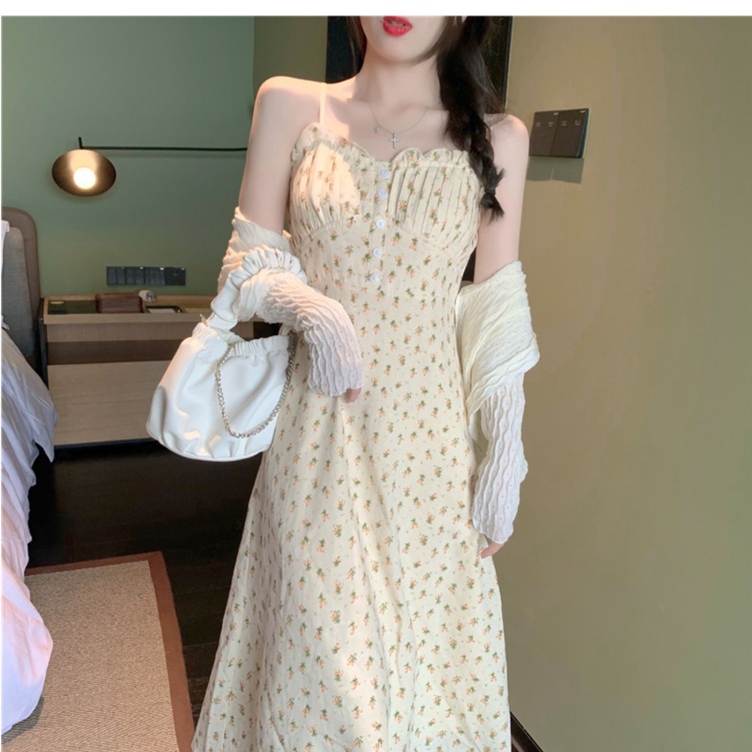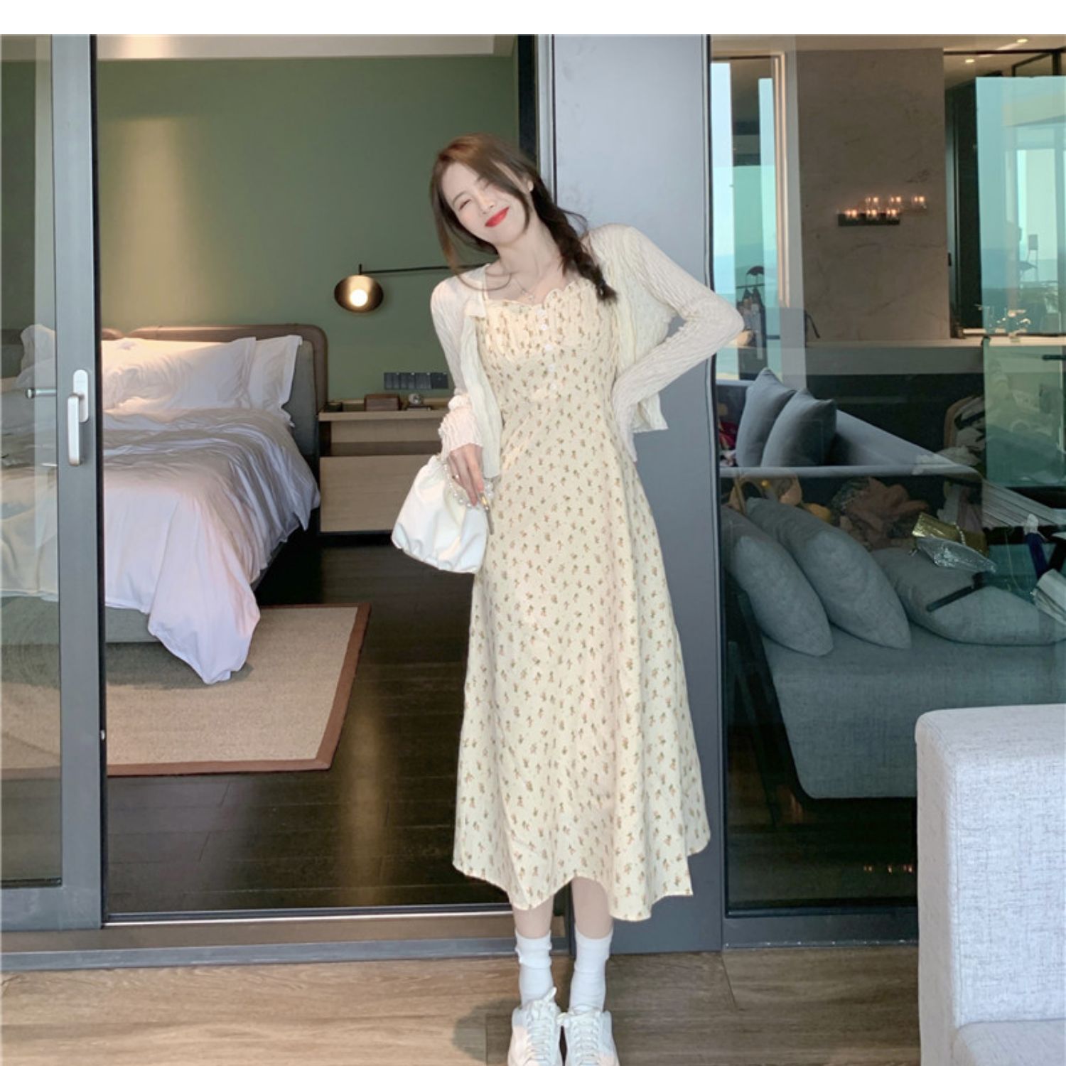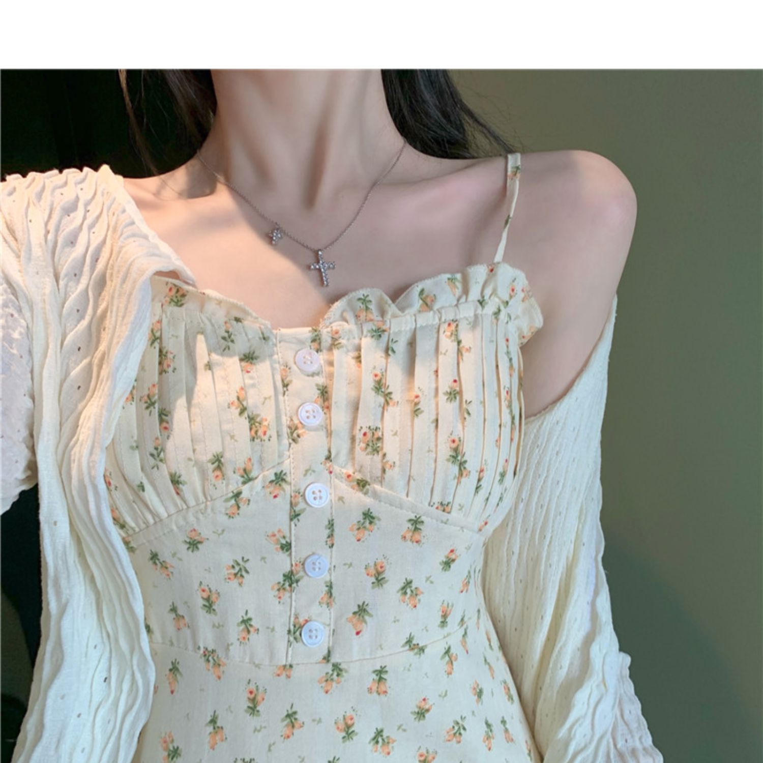 颜色 花色连衣裙+杏色开衫 单吊带裙小清新