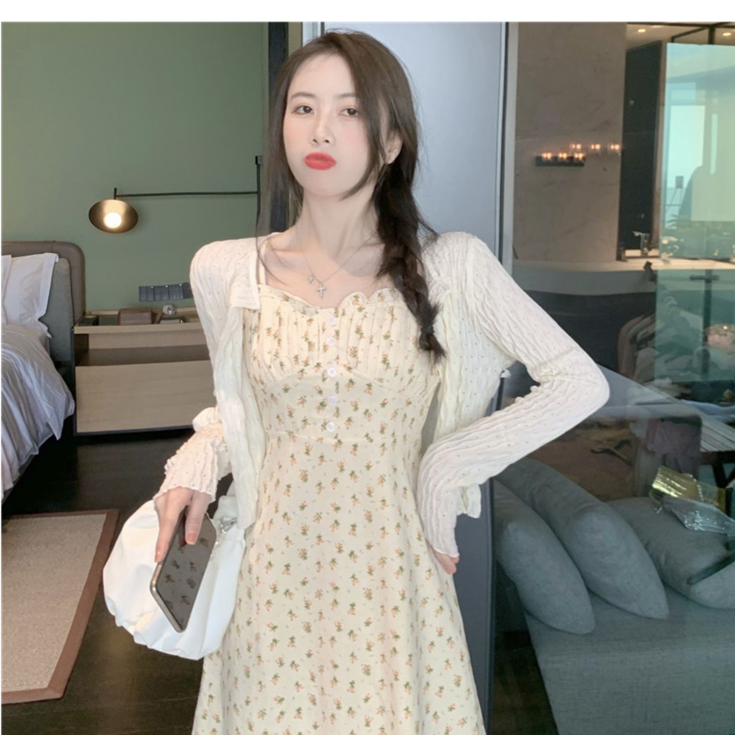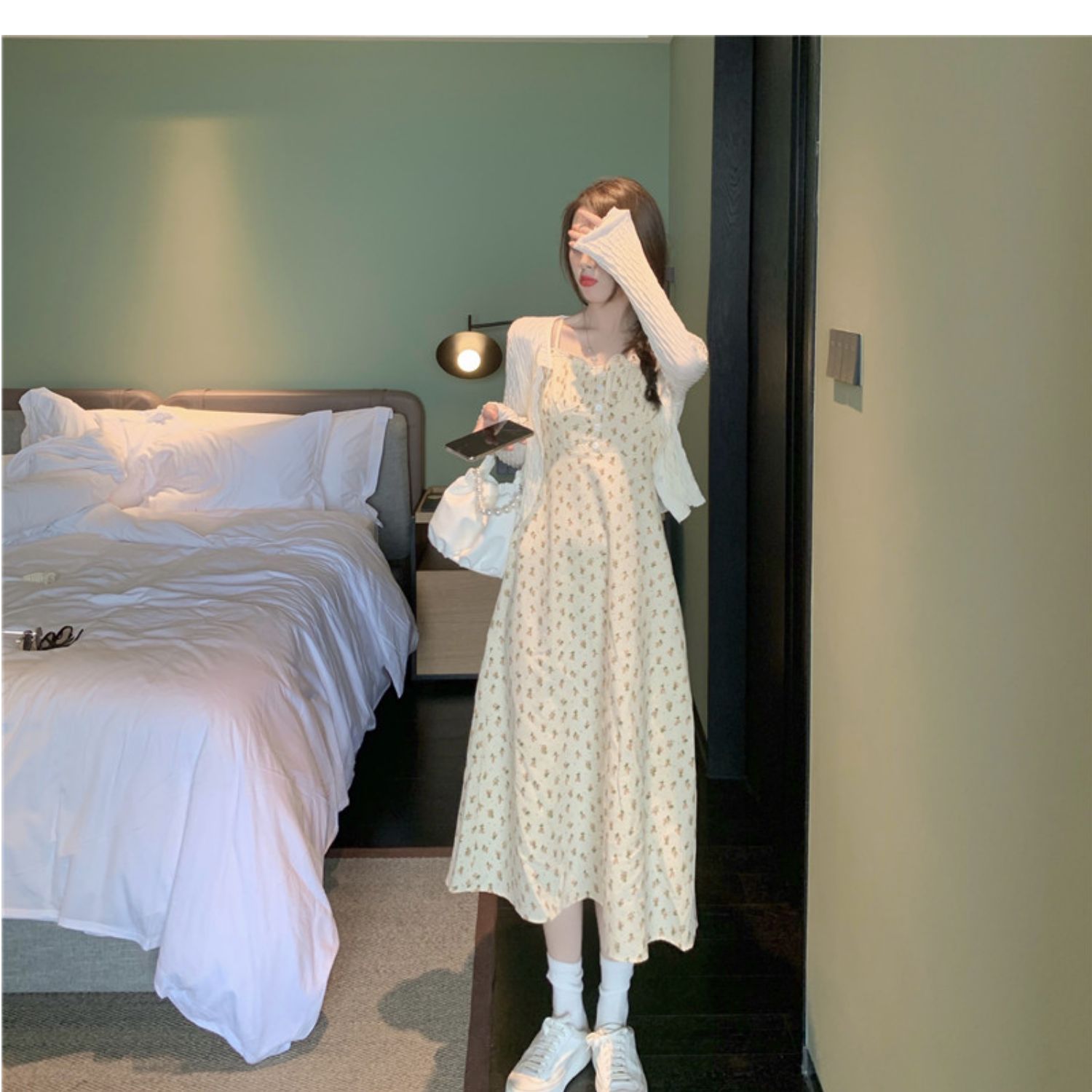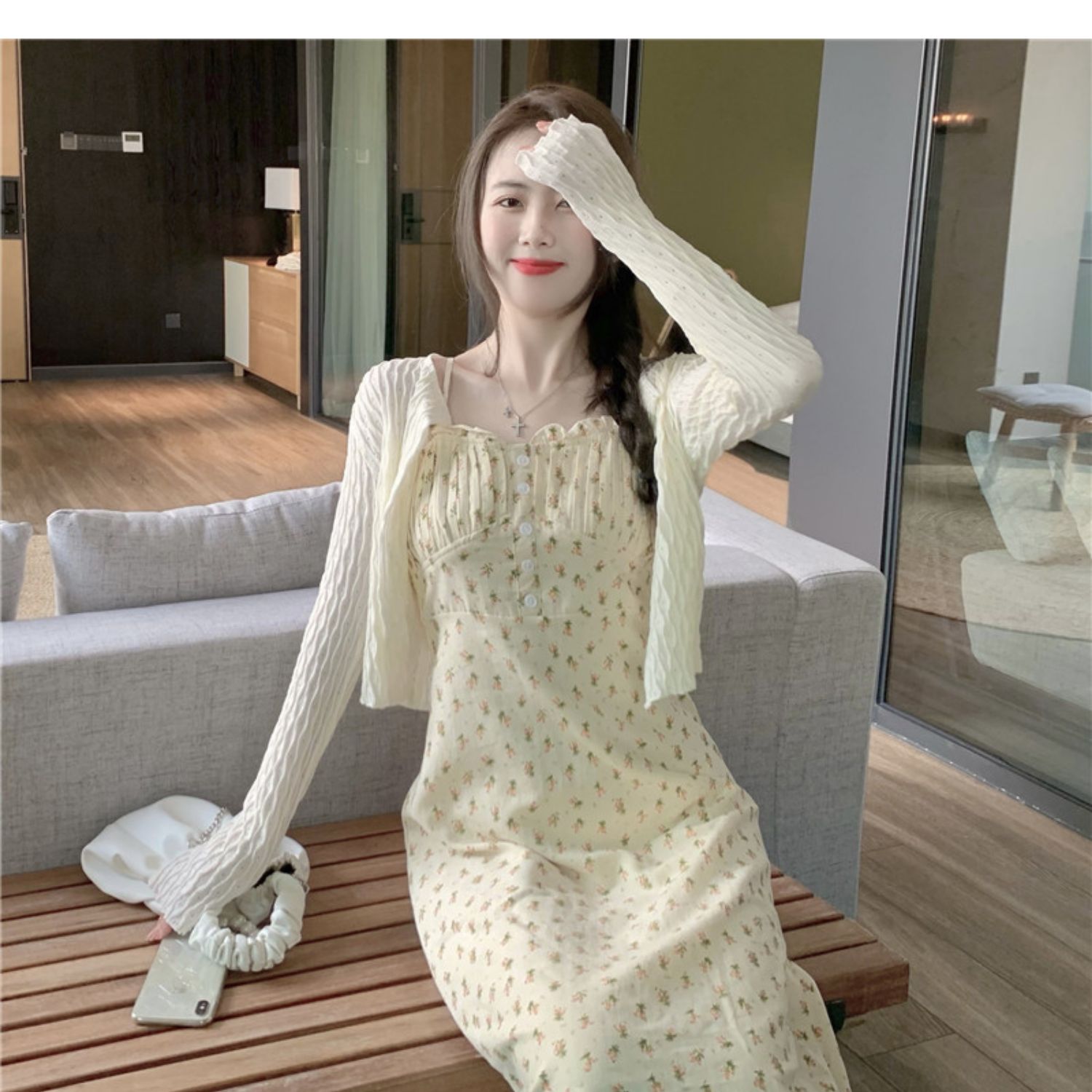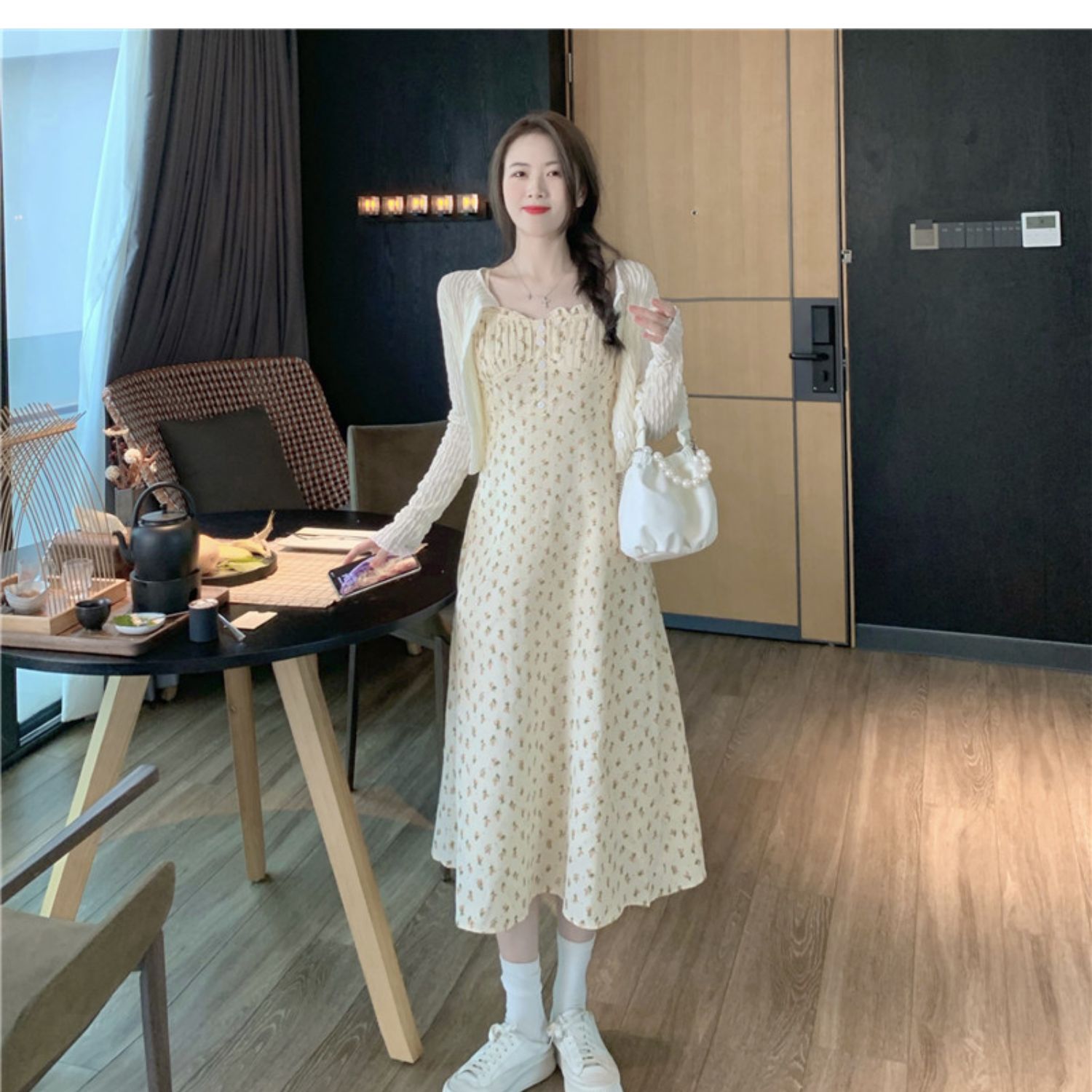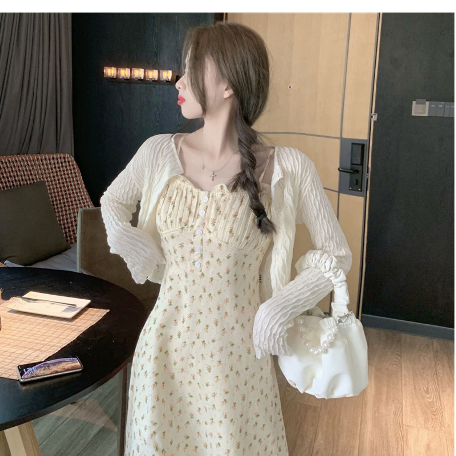 颜色 花色连衣裙+杏色开衫 单吊带裙小清新