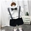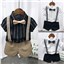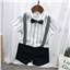 颜色 F00019白色白条纹(衬衫裤子黑波浪领结黑背带) F00019黑色白条纹(衬衫裤子香槟领结卡其背带) F00019白色黑条纹(衬衫裤子黑领结黑背带)