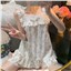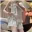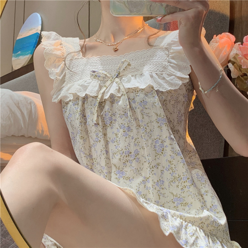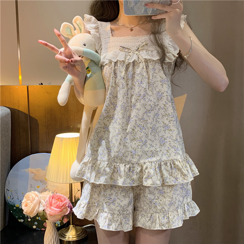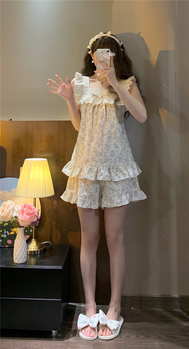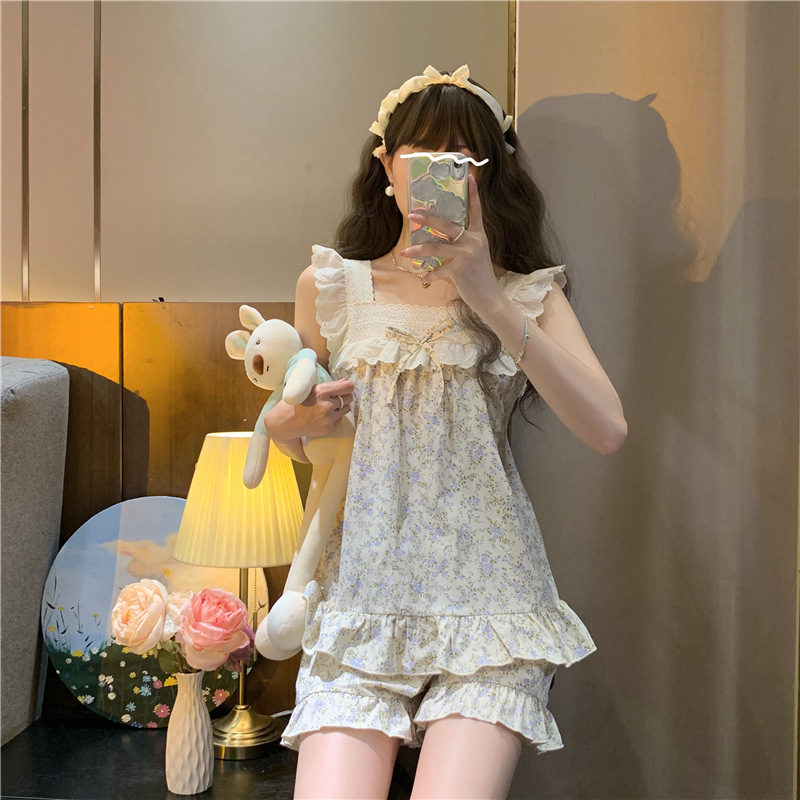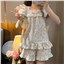 颜色 吊带短裤方口领蓝花蝴蝶结套装