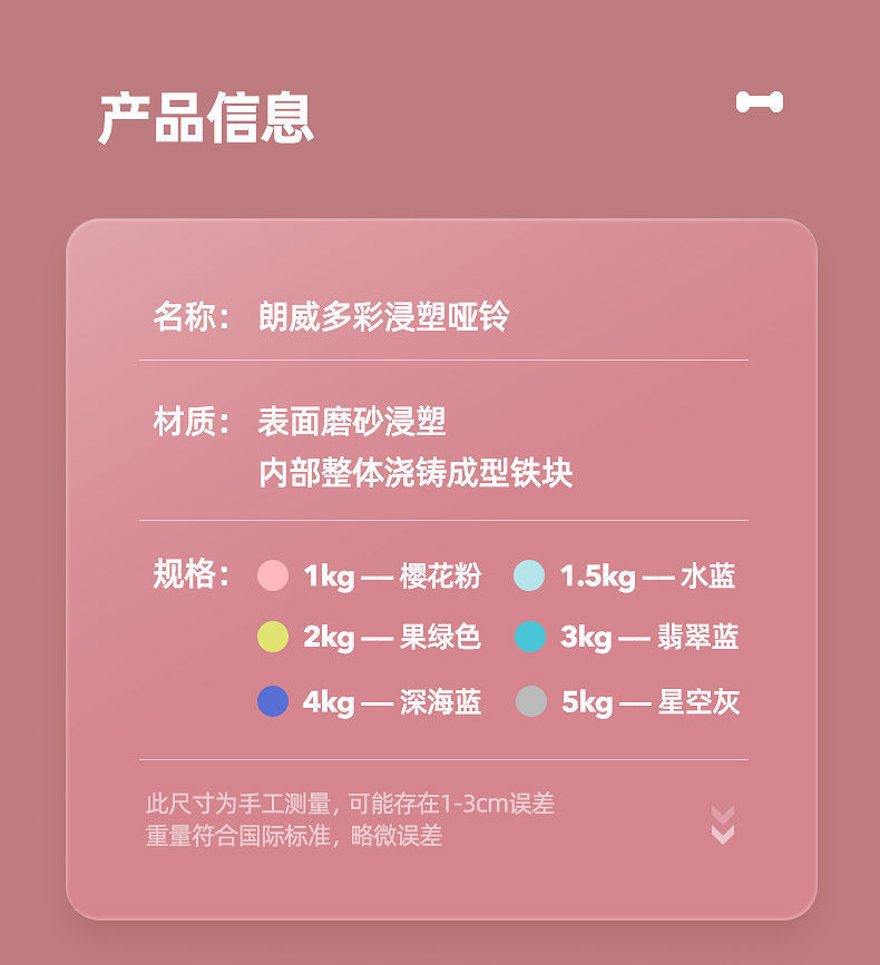 颜色 樱花粉_1KG*2 水蓝色_1.5KG*2 果绿色_2KG*2 翡翠蓝_3KG*2 深海蓝_4KG*2 星空灰_5KG*2 1/2/3KG三对(初学套装) 1/2/3KG三对+礼盒(初学套装) 2/3/4KG三对(塑型入门) 3/4/5KG三对+铁质架(进阶推荐 深橘色_6KG*2 酒红色_8KG*2 黑色_10KG*2 三层铁质哑铃架
