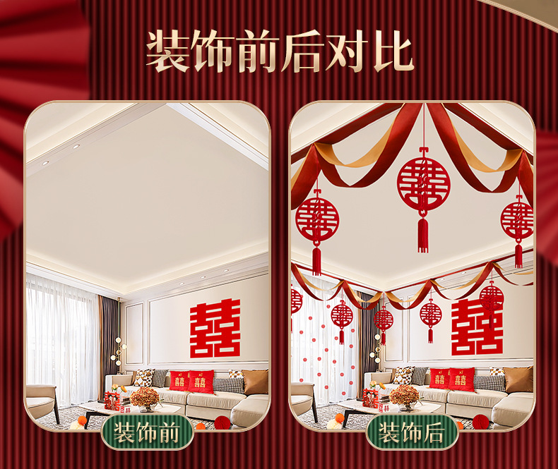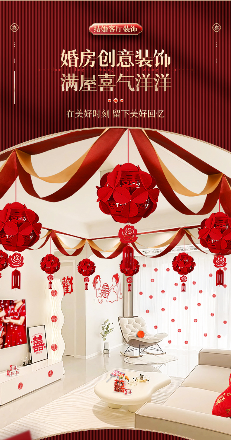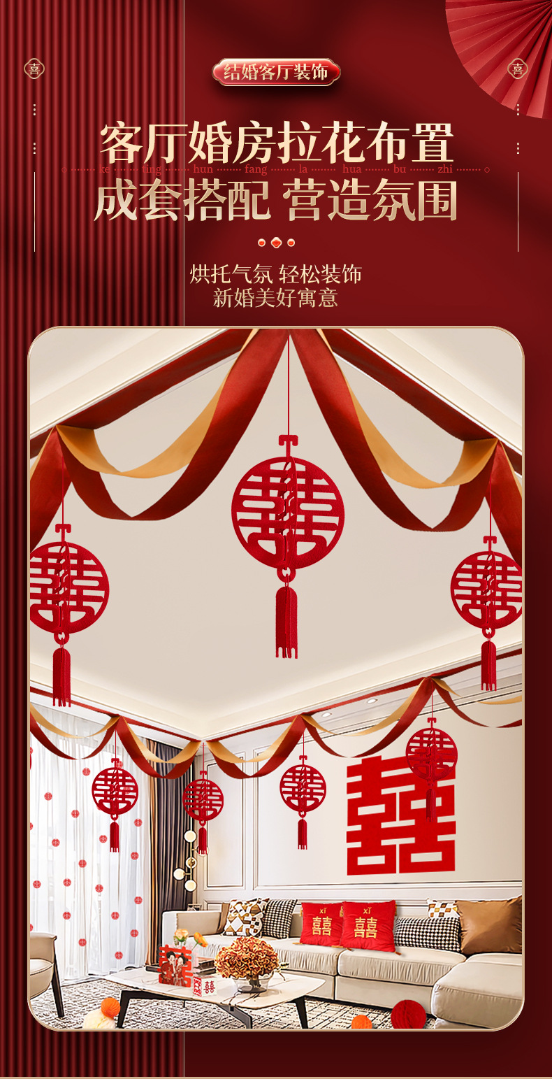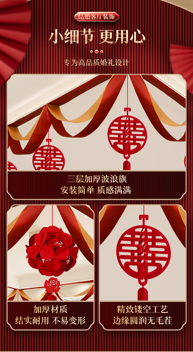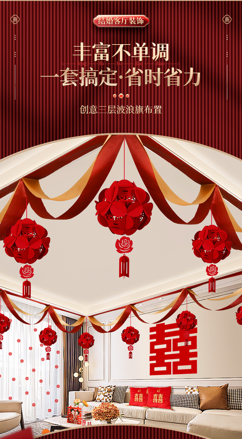颜色 波浪旗+立体圆喜吊坠 波浪旗+立体正喜吊坠 波浪旗+立体绣球吊坠 波浪旗+新婚快乐吊坠 波浪旗+三生三世吊坠 波浪旗4条(赠送粘钩) 天长地久立体正喜吊坠 新婚快乐立体圆喜吊坠