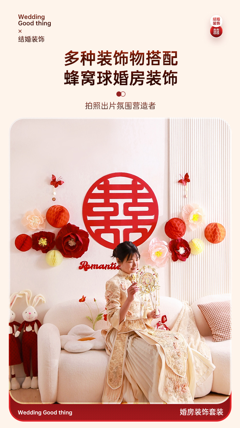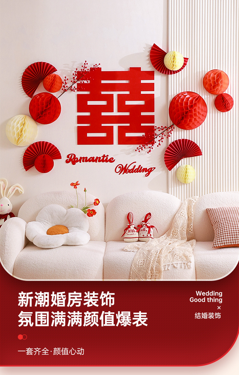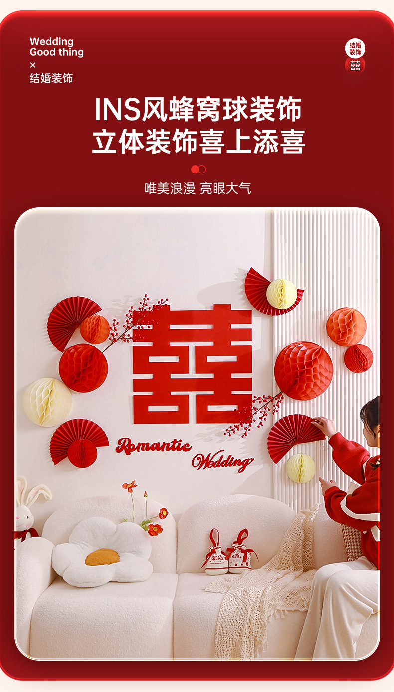 结婚客厅装饰女方婚礼新房卧室蜂窝球背景墙喜字拉花婚房布置套装