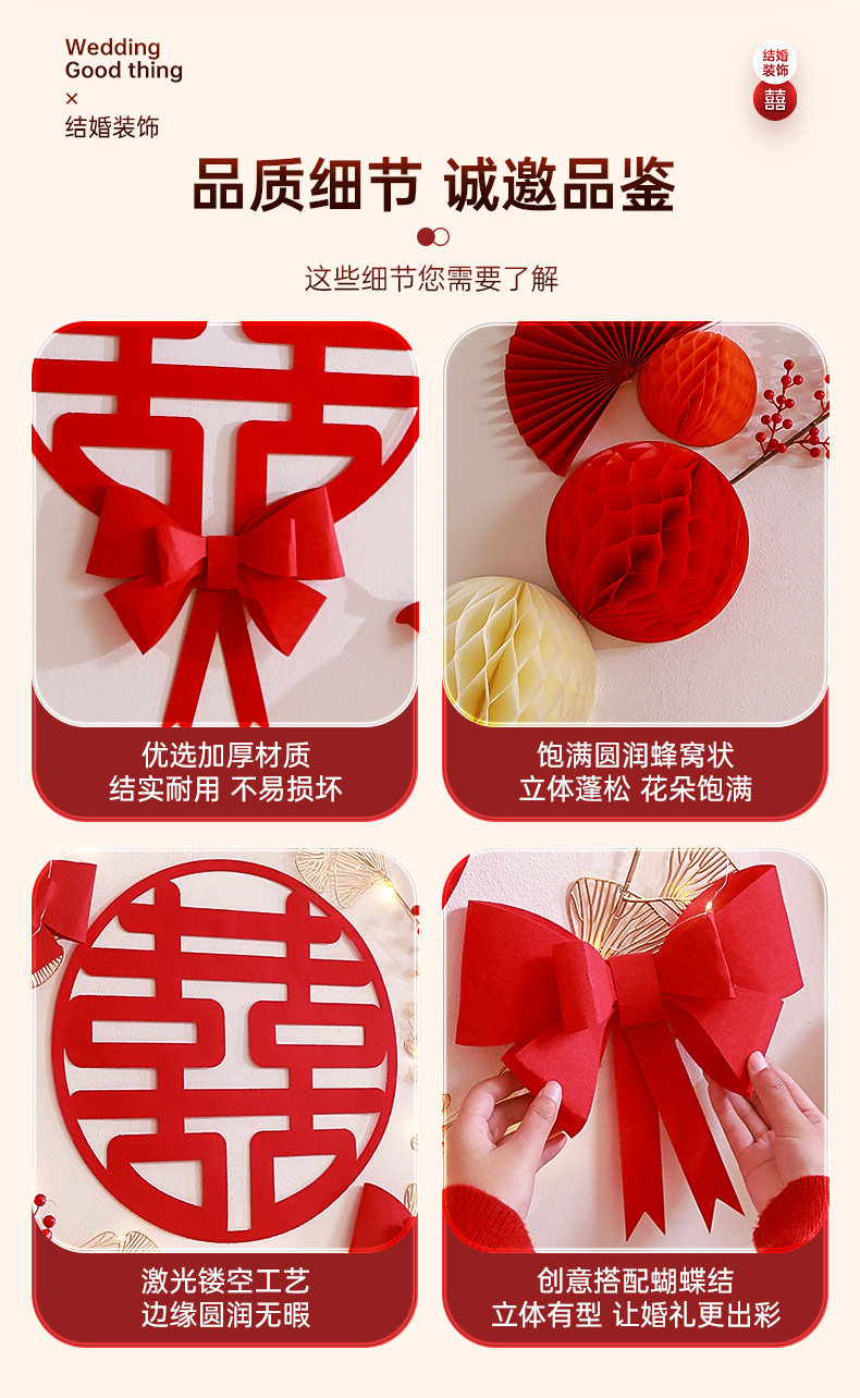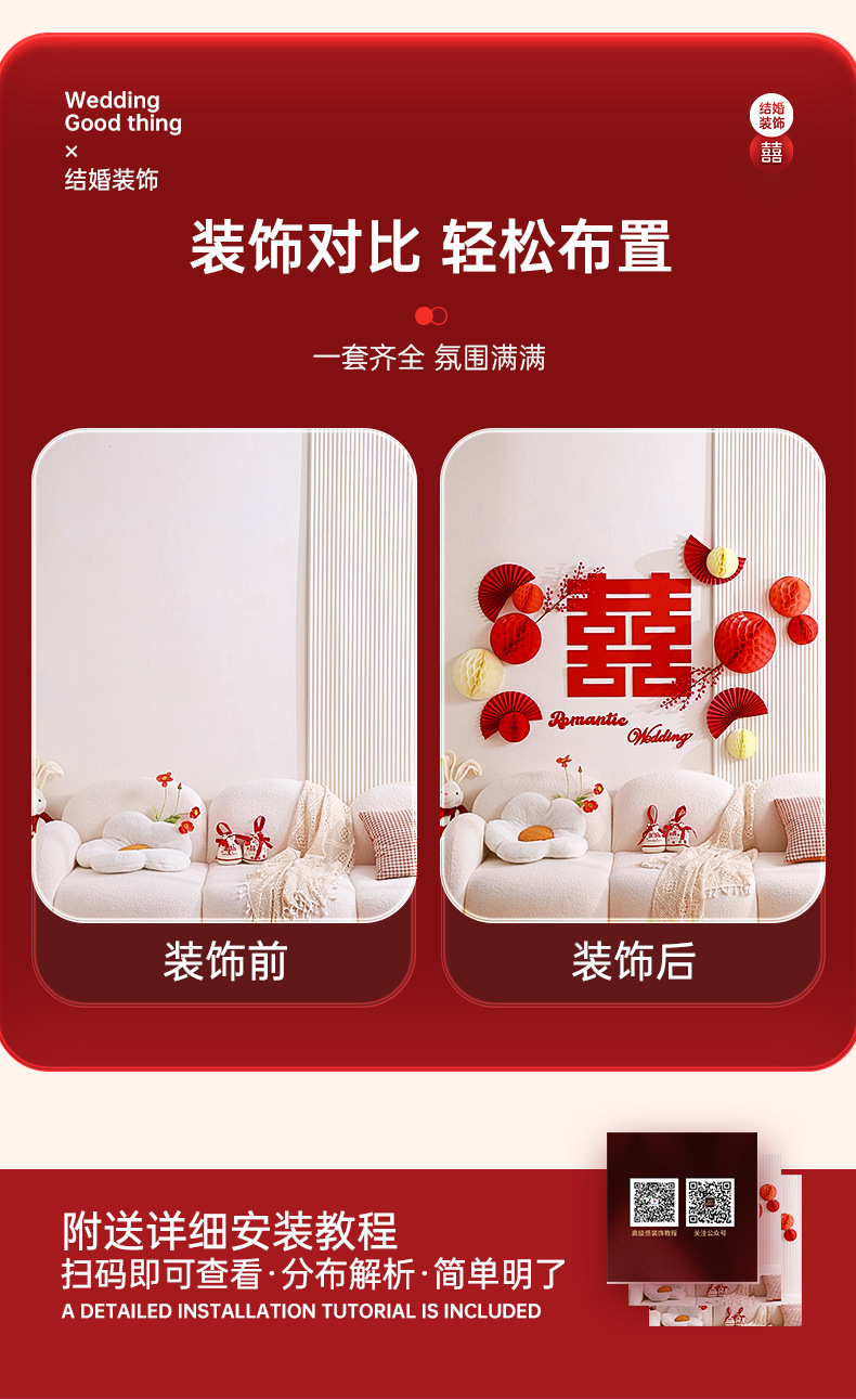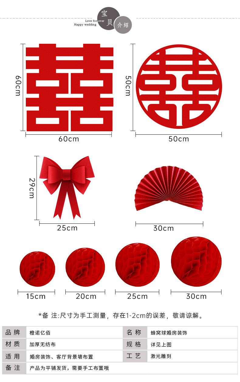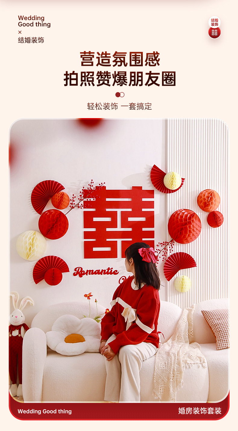 结婚客厅装饰女方婚礼新房卧室蜂窝球背景墙喜字拉花婚房布置套装