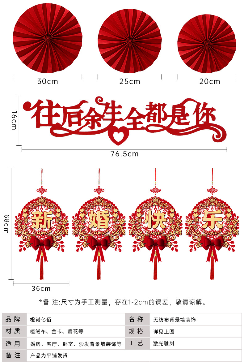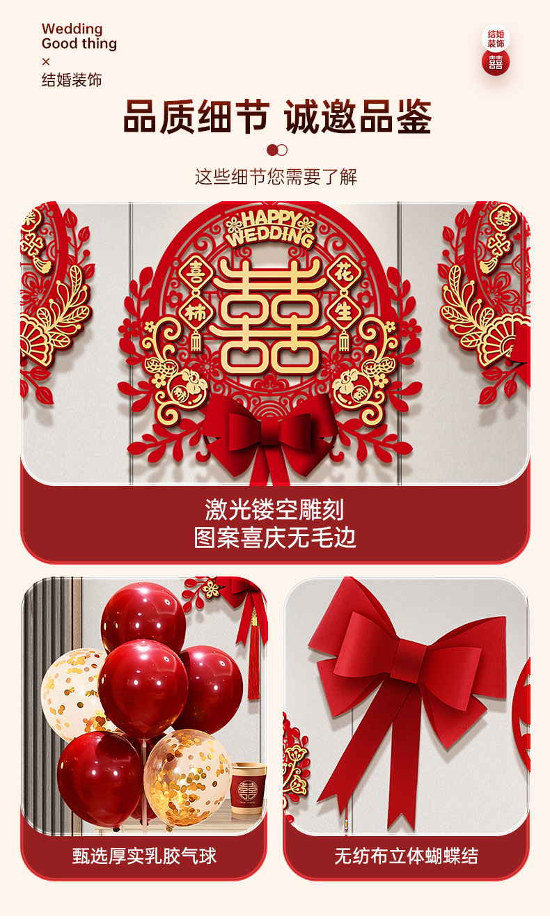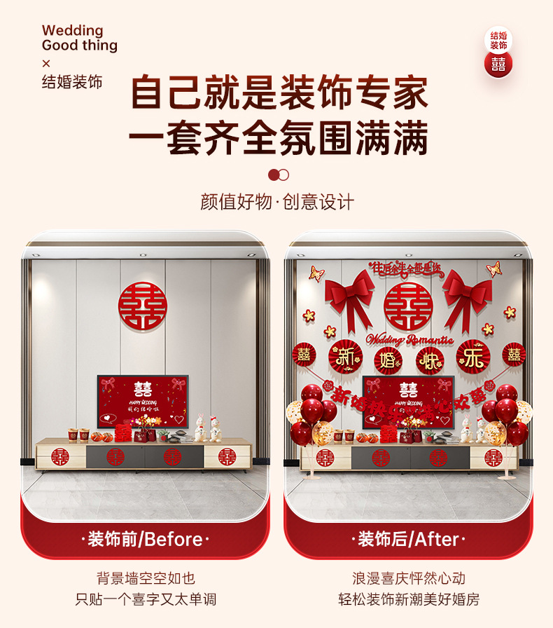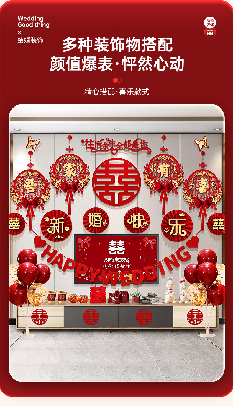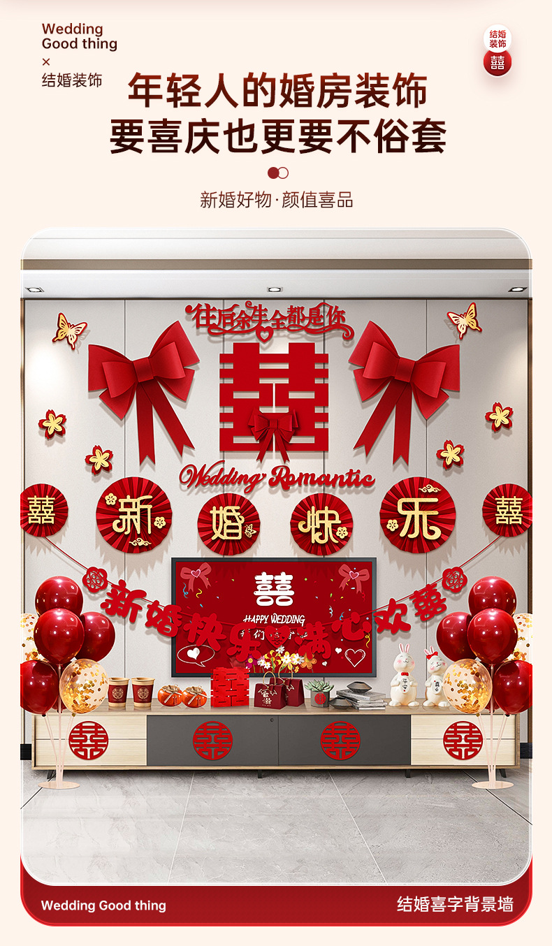 结婚客厅装饰女方婚礼新房卧室电视机背景墙喜字拉花婚房布置套装