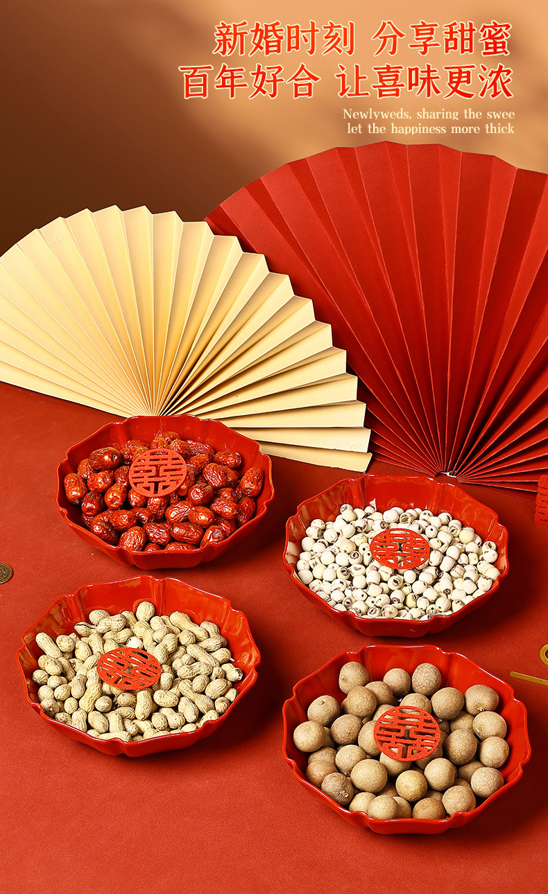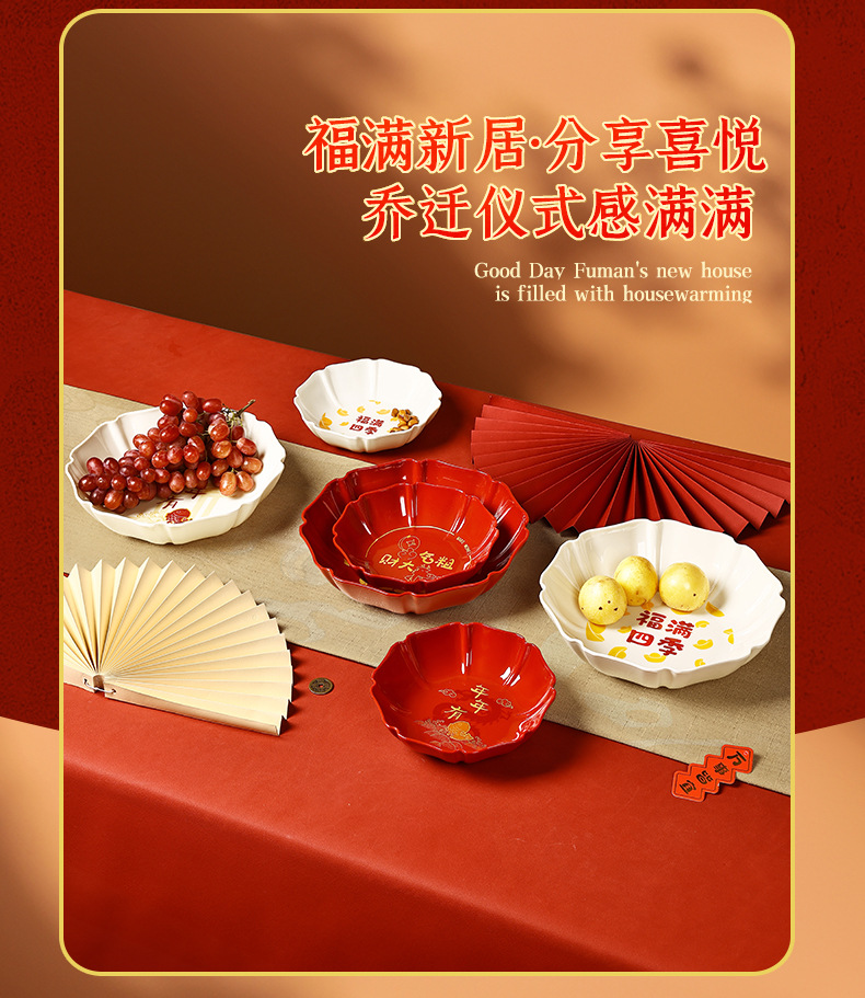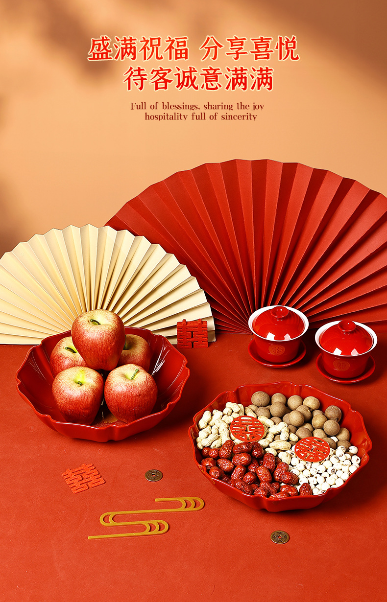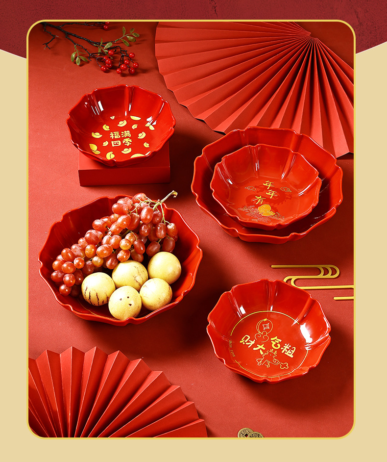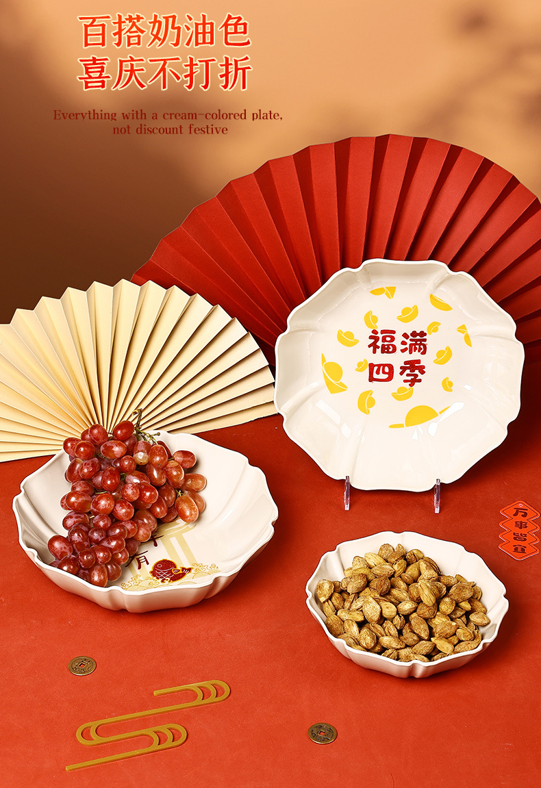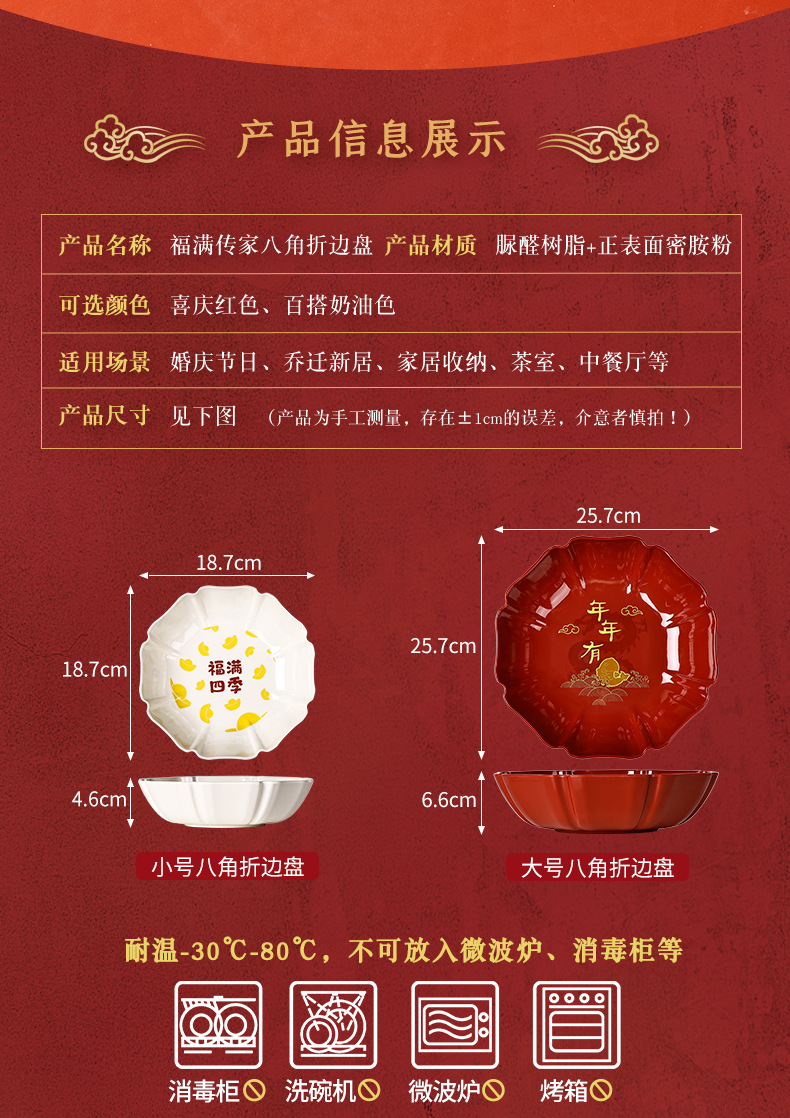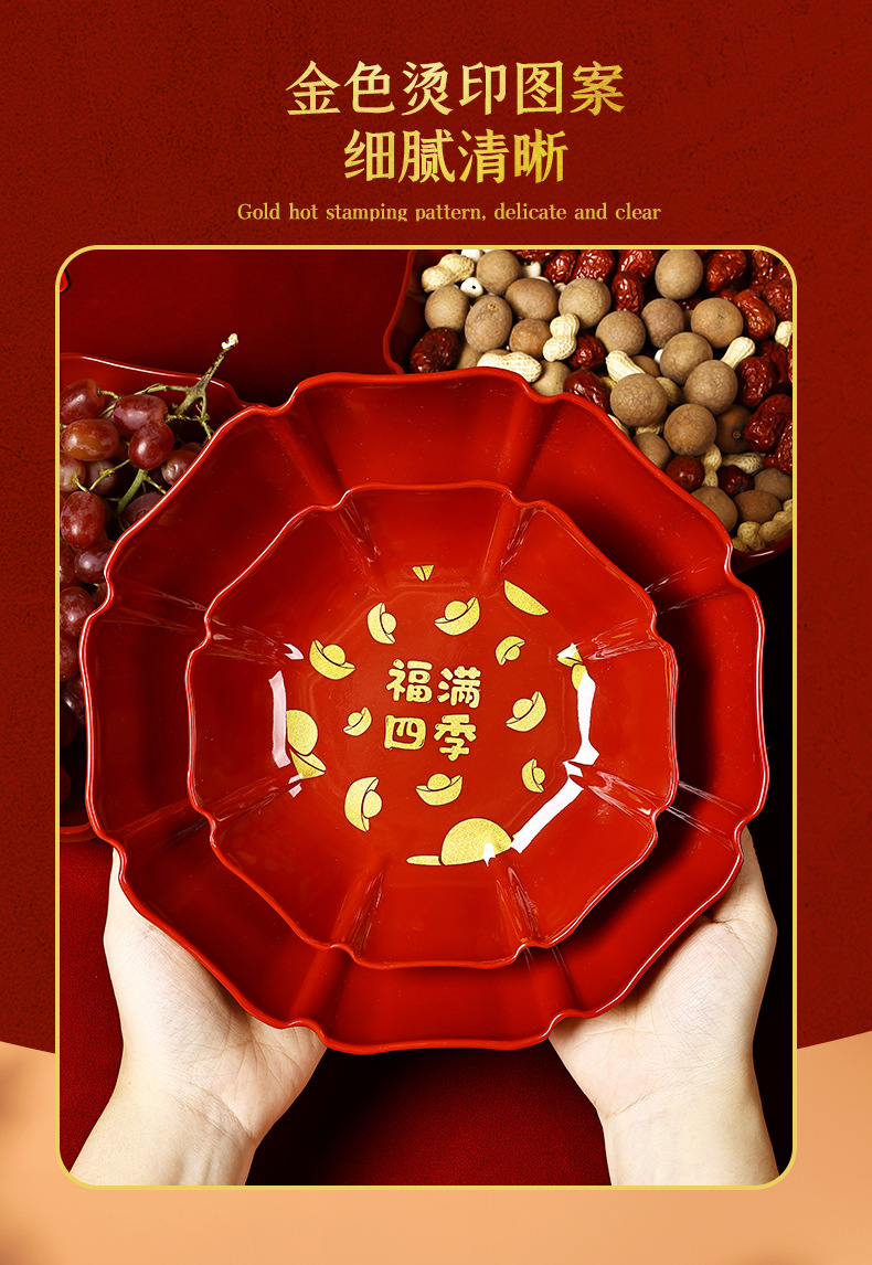 八角托盘家用待客糖果盘中式新年年货干果盘福满四季深盘脲醛树脂
