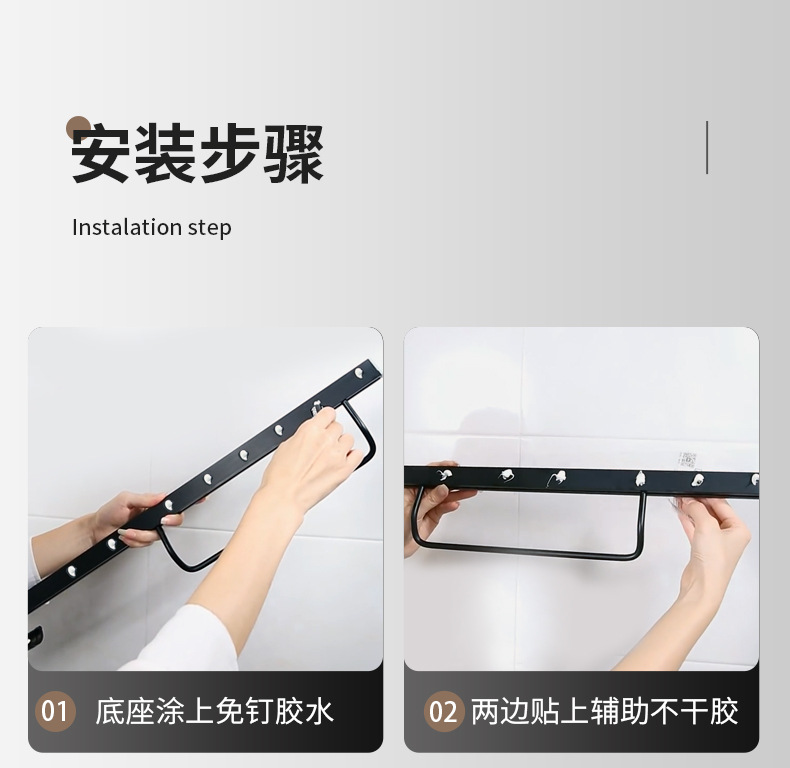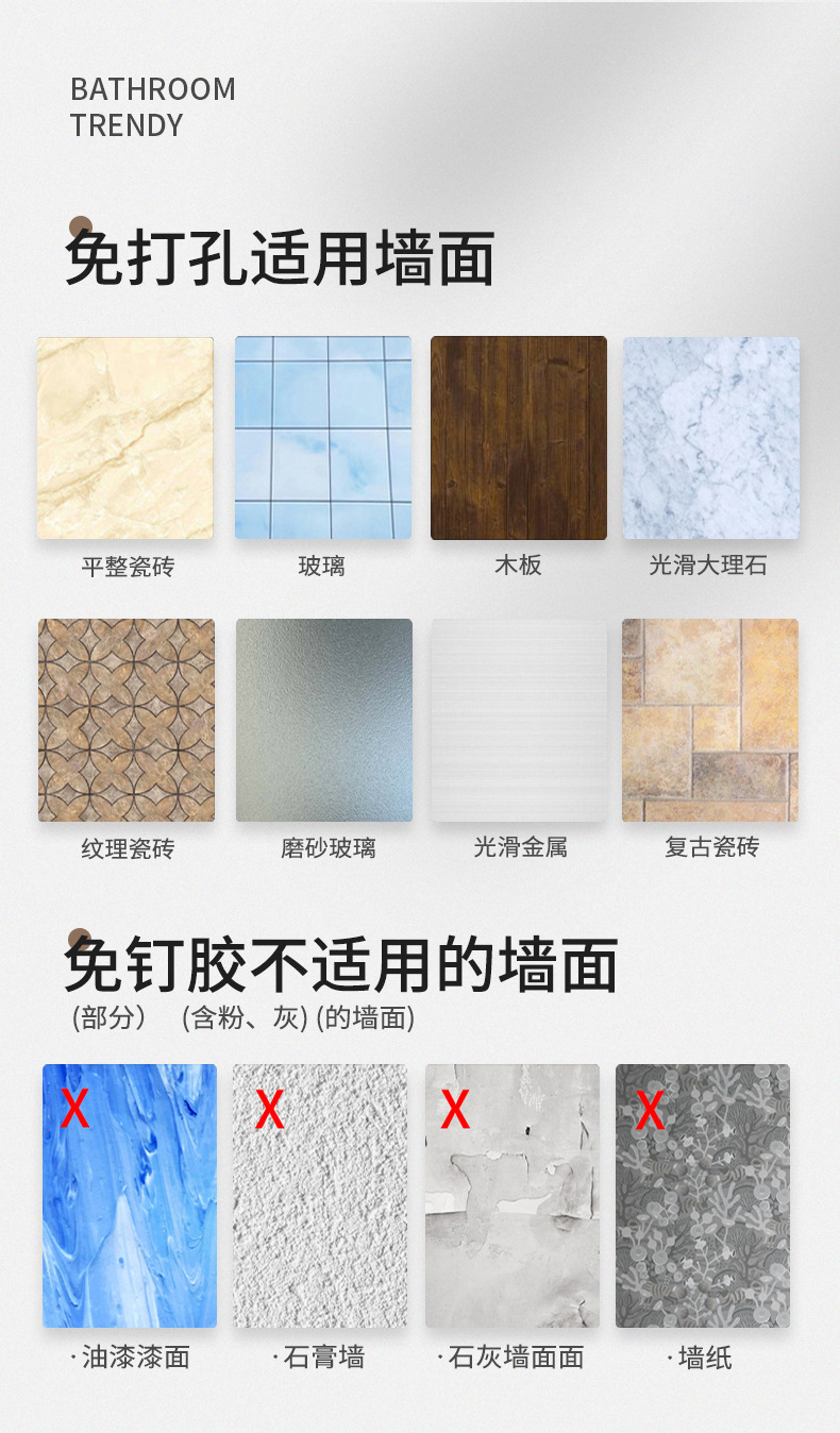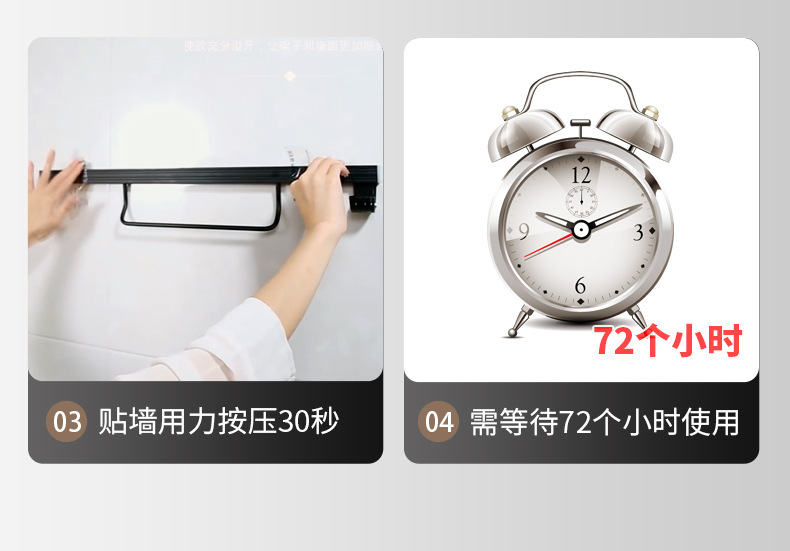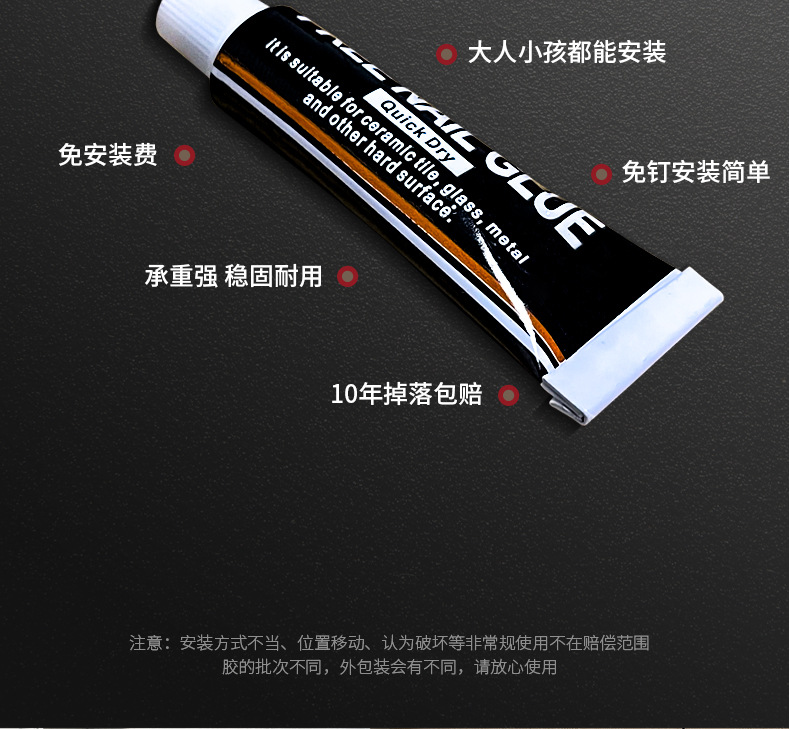 (2)免打孔安装请注意,安装前请看,墙面需平整坚固的玻璃瓷砖等,不可用在粉刷墙,墙纸,石灰墙等不平整不坚固的墙面上。涂胶上墙后需等待3-5天,免钉胶完全干透再使用!