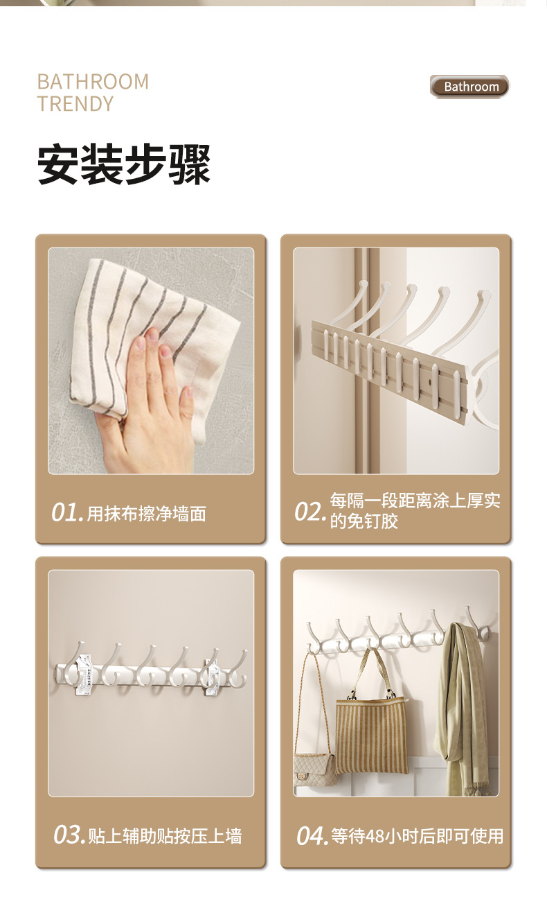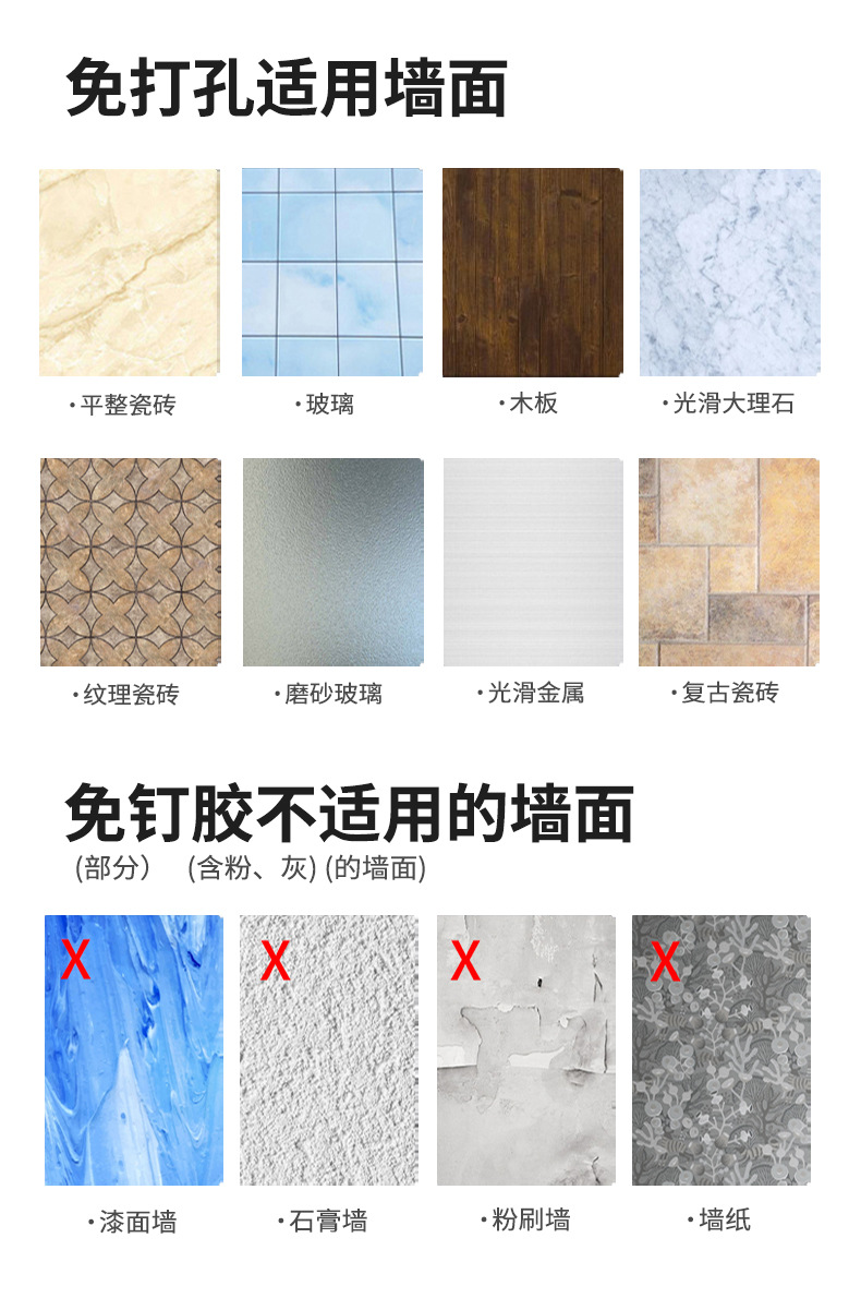 (2)免打孔安装请注意,安装前请看,墙面需平整坚固的玻璃瓷砖等,不可用在粉刷墙,墙纸,石灰墙等不平整不坚固的墙面上。涂胶上墙后需等待3-5天,免钉胶完全干透再使用!(不正确安装没有十年掉落理赔保障哦。)