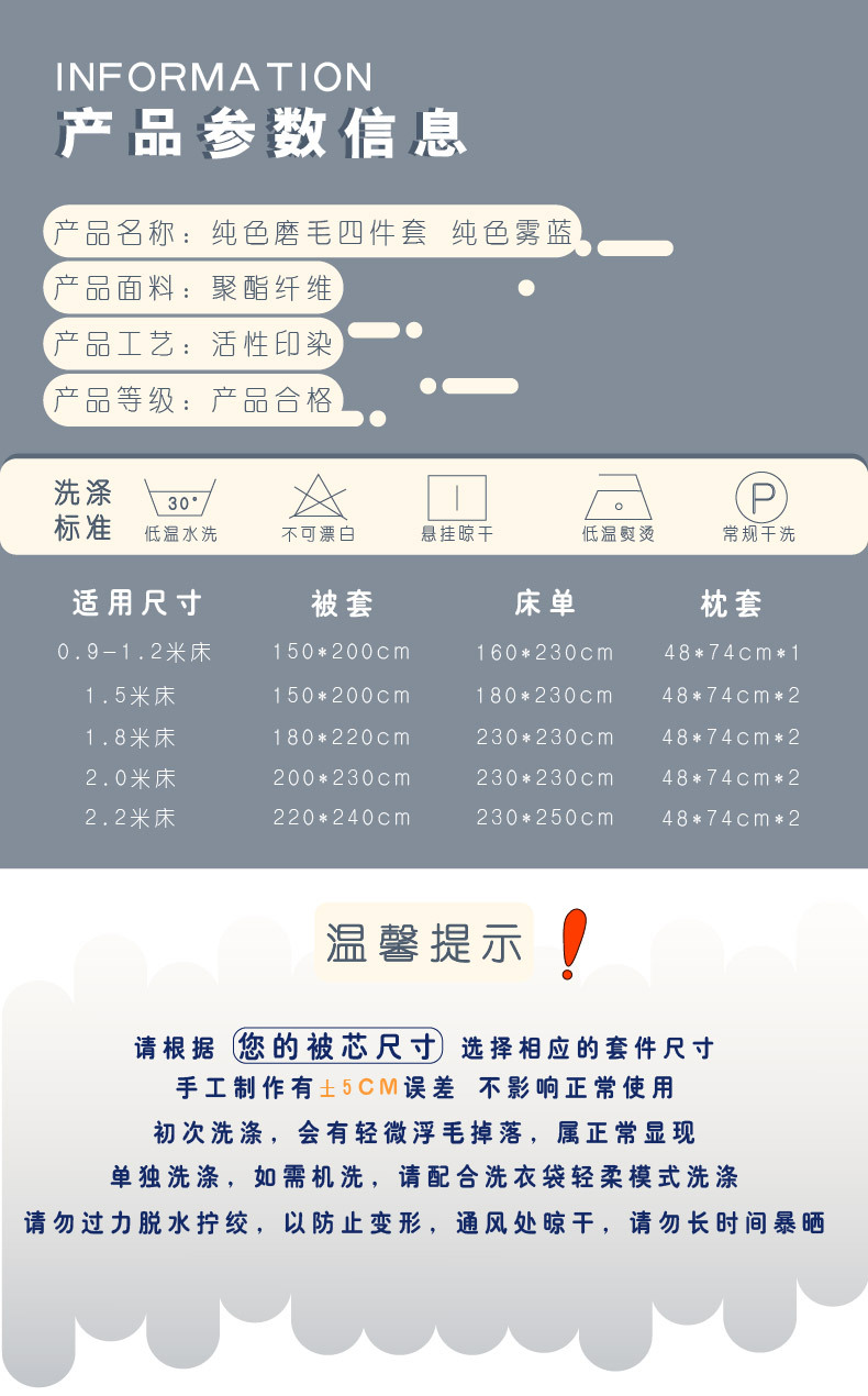 尺码 1.2M床三件套【被套150*200】 1.5M床四件套【被套150*200】 1.8M床四件套【被套180*220】 2.0M床四件套【被套200*230】 2.2M床四件套【被套220*240】