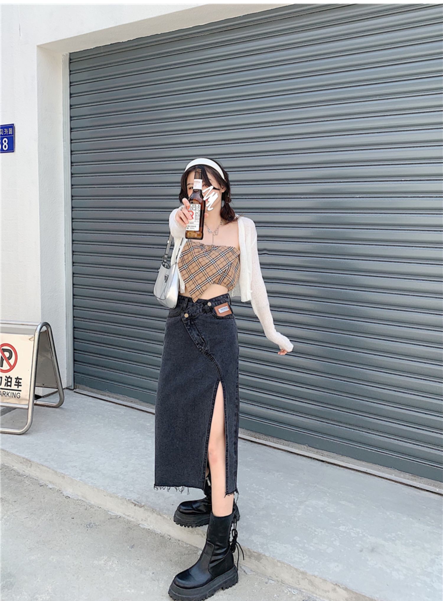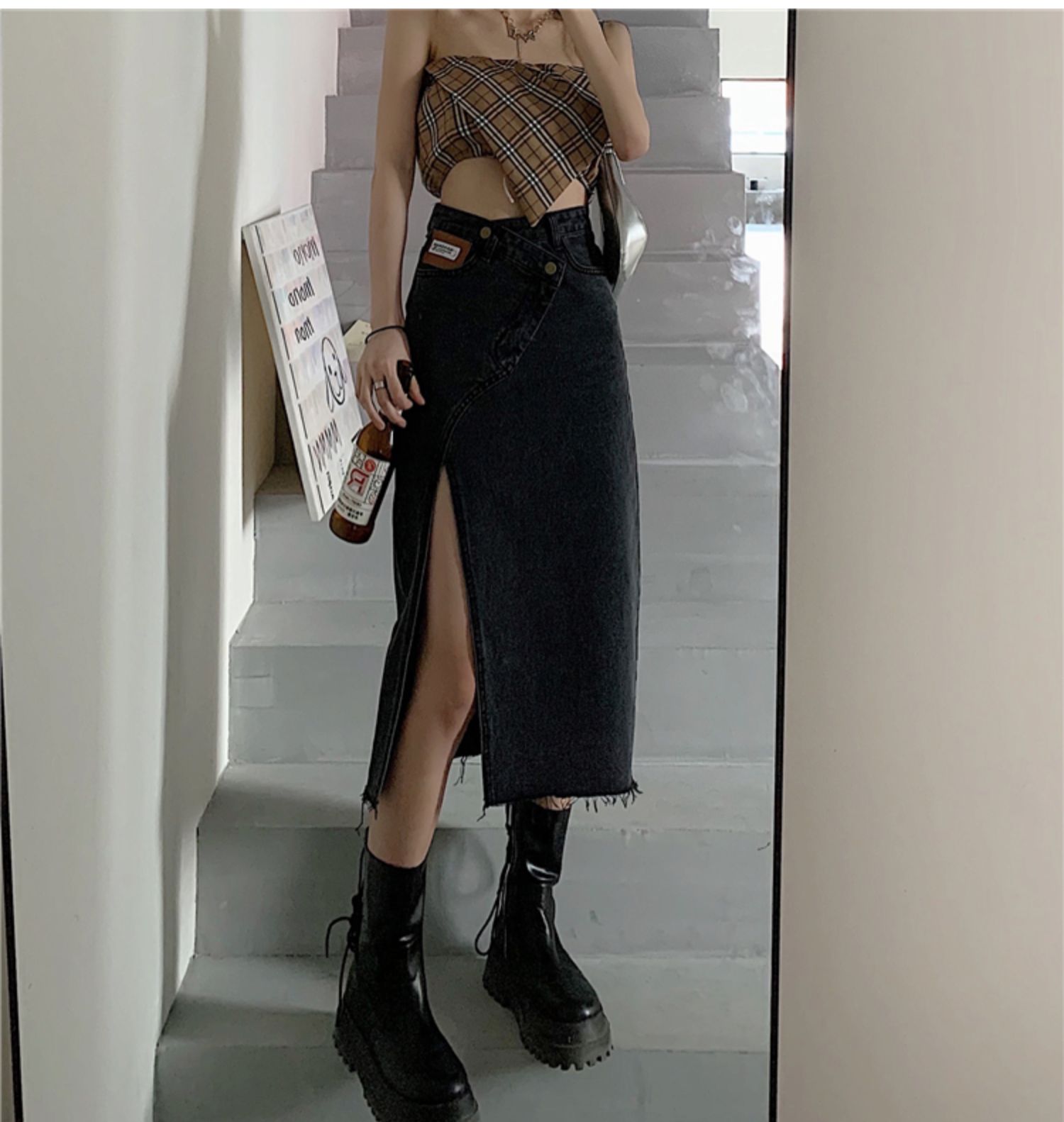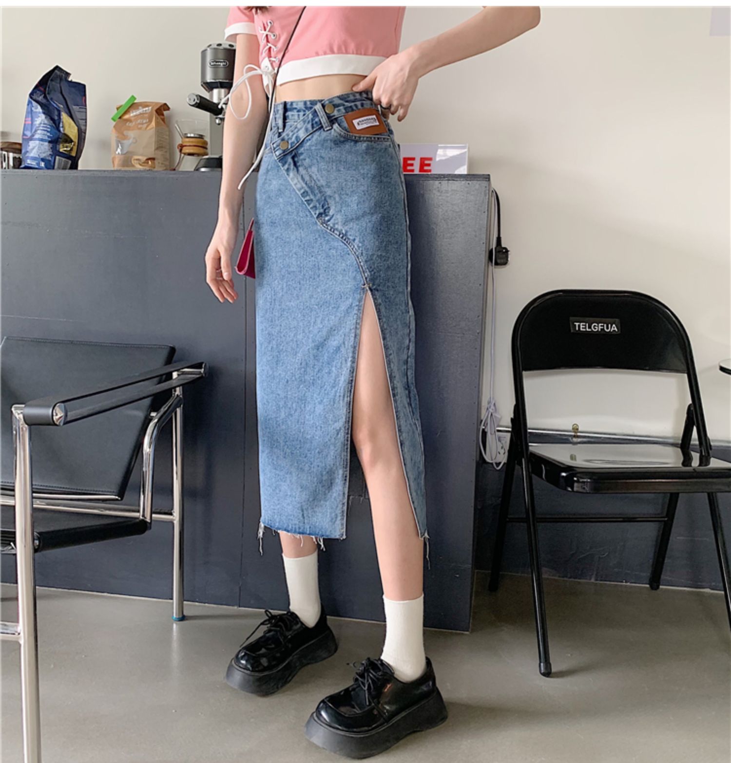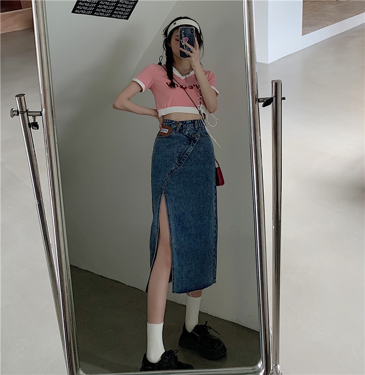 大码女装开叉高腰牛仔半身裙秋装新款胖妹妹a字减龄显瘦中长裙子