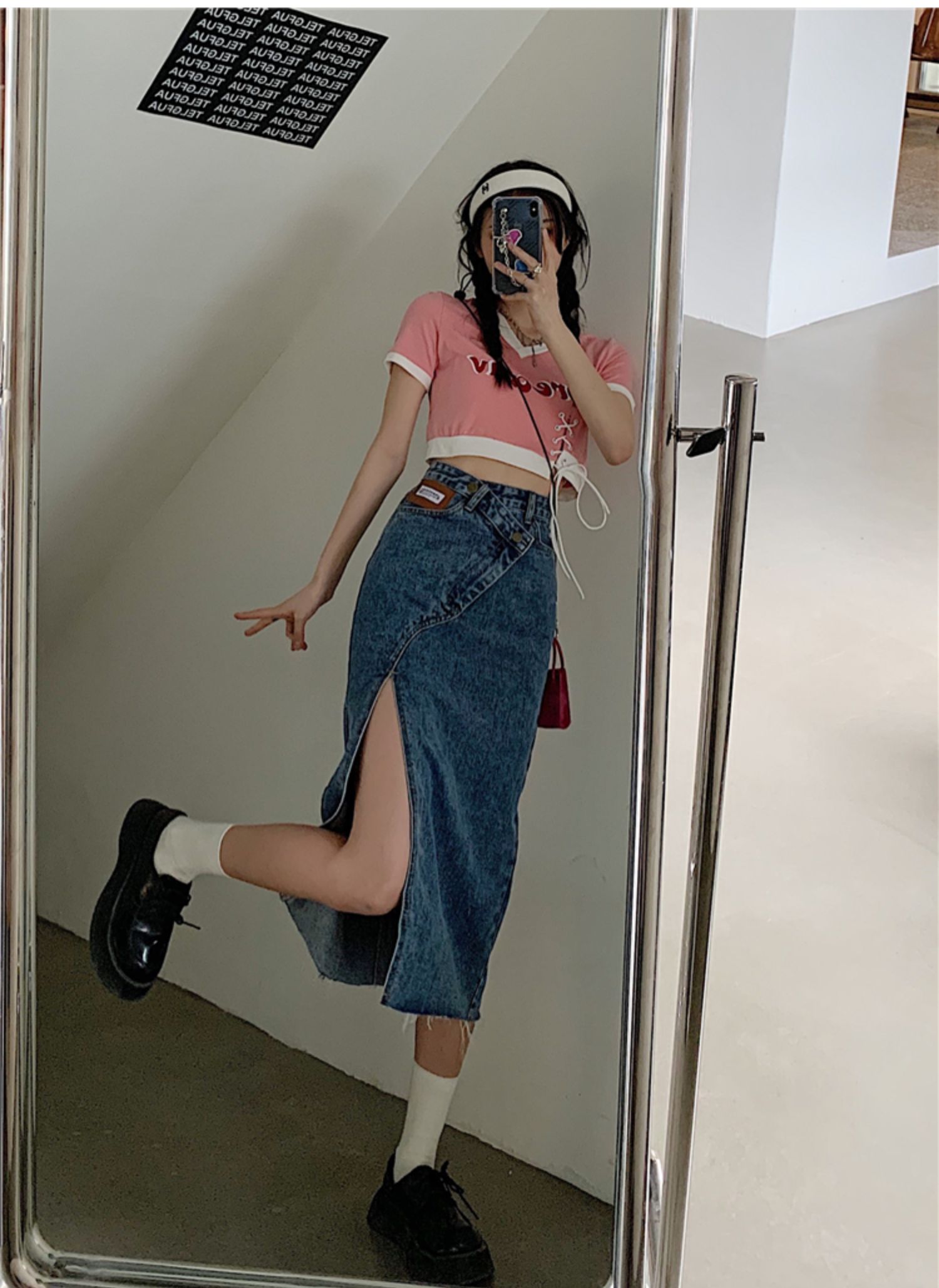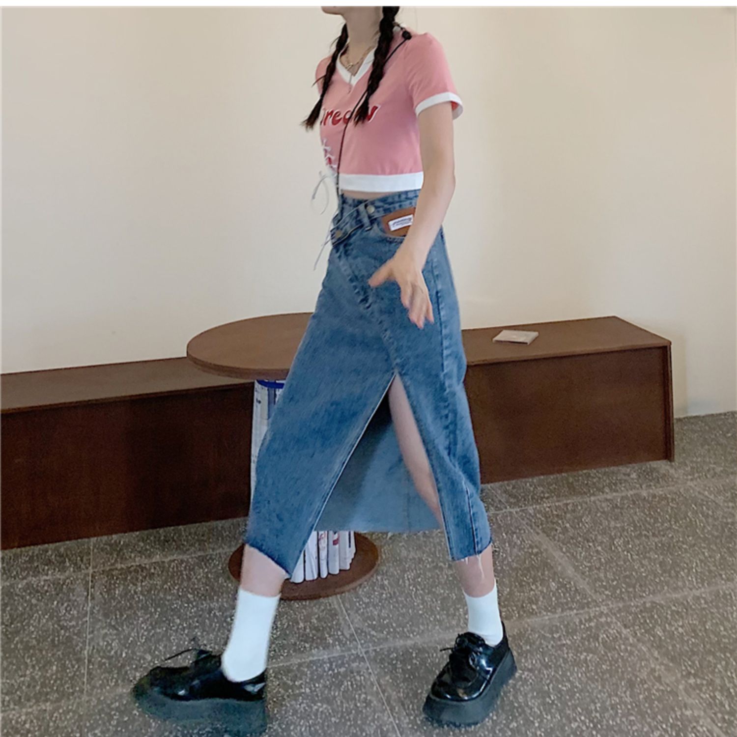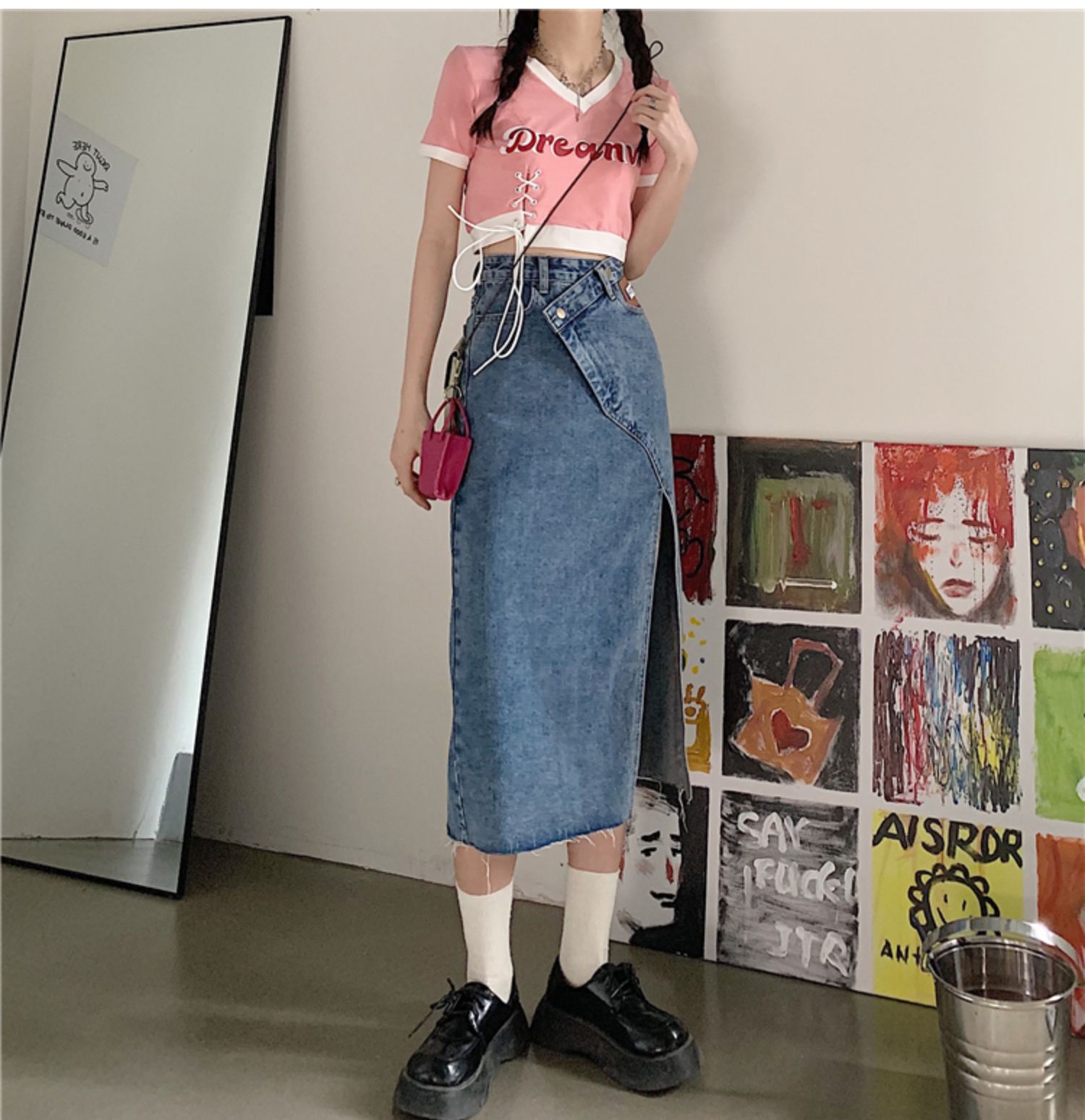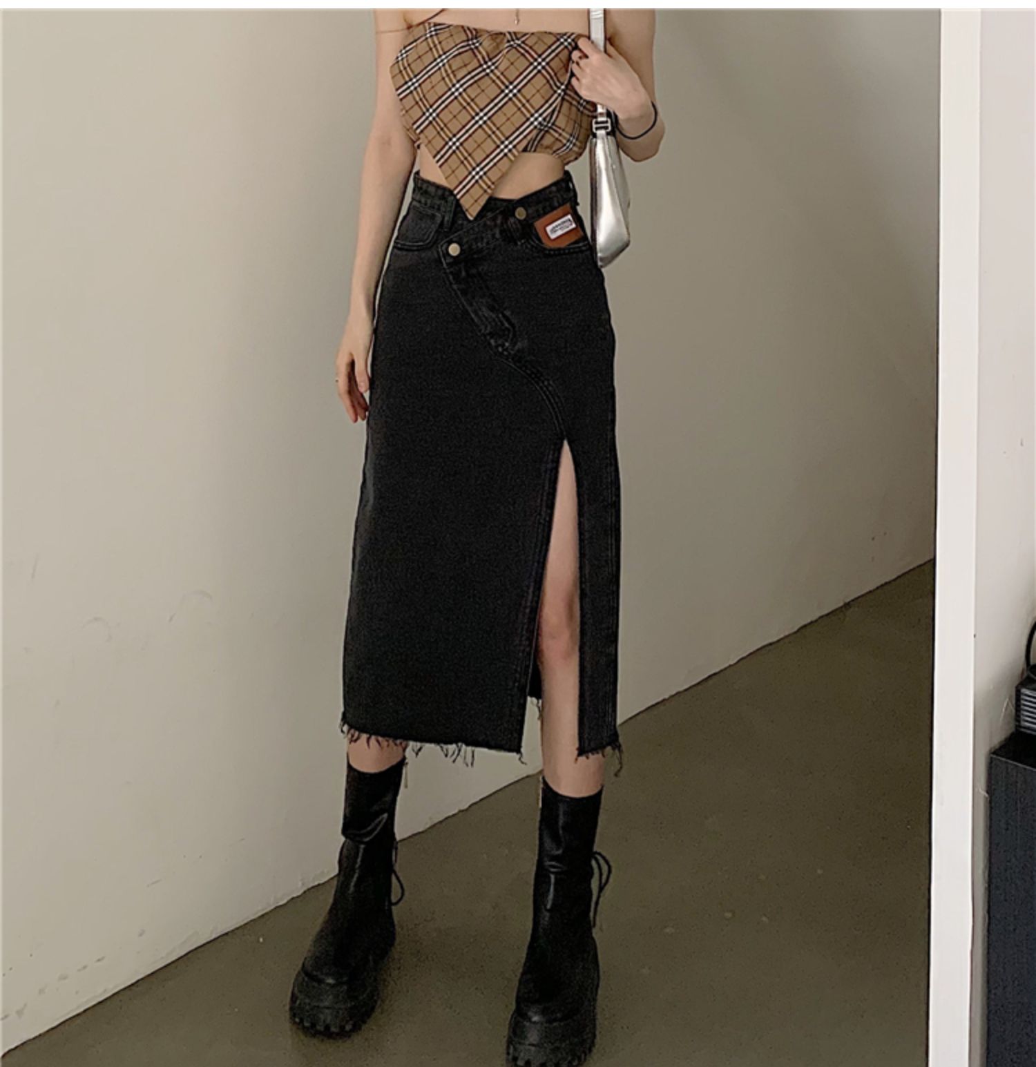 大码女装开叉高腰牛仔半身裙秋装新款胖妹妹a字减龄显瘦中长裙子