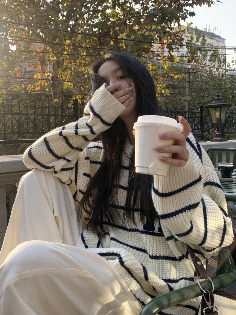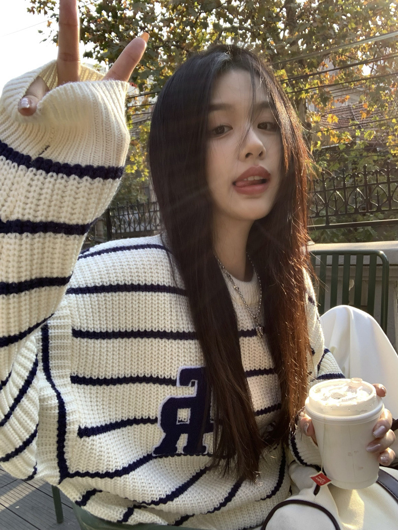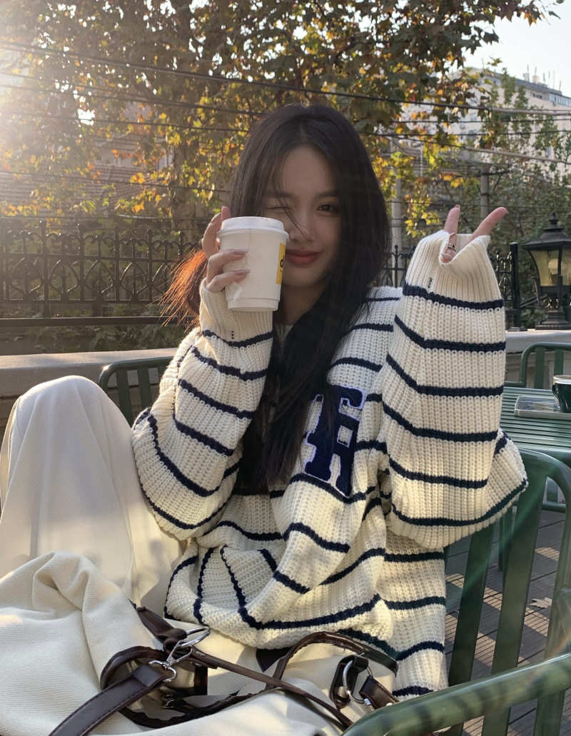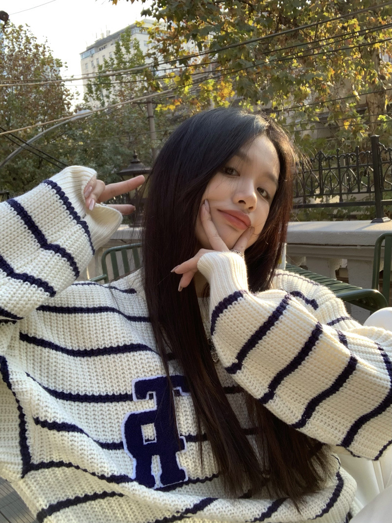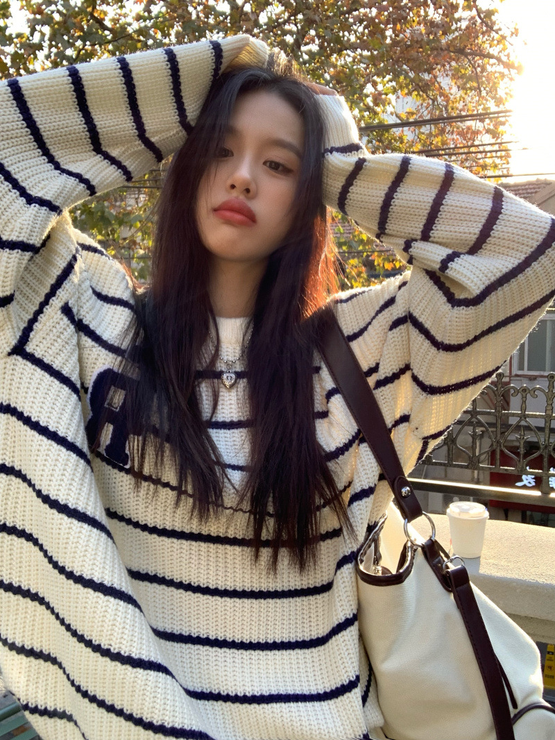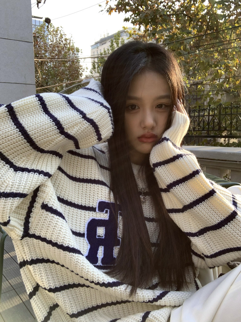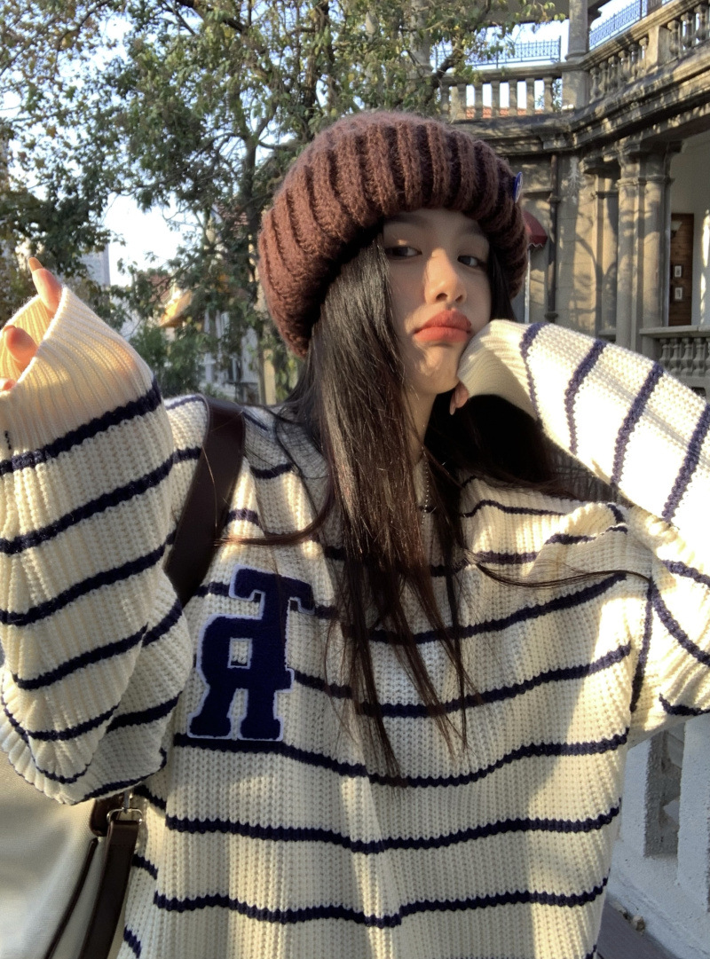 货号:大码刺绣条纹圆领套头毛衣女53