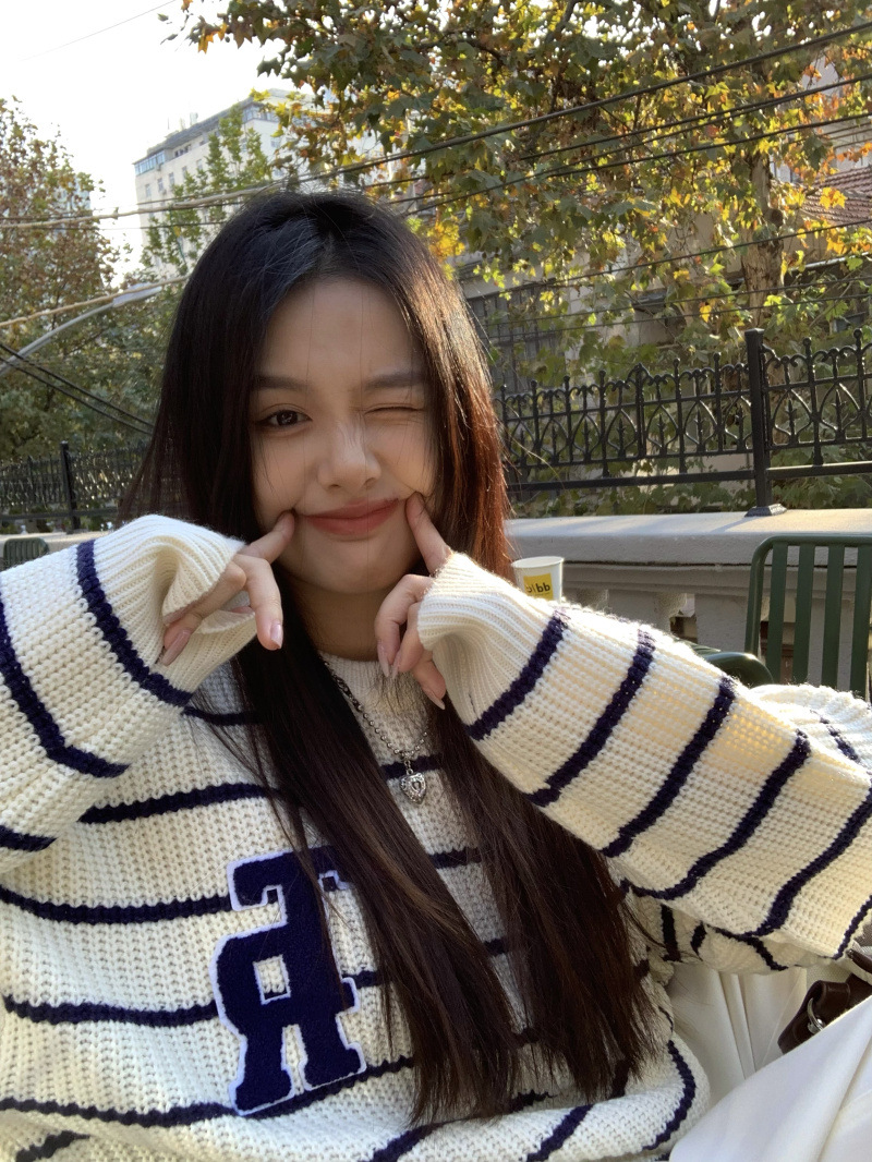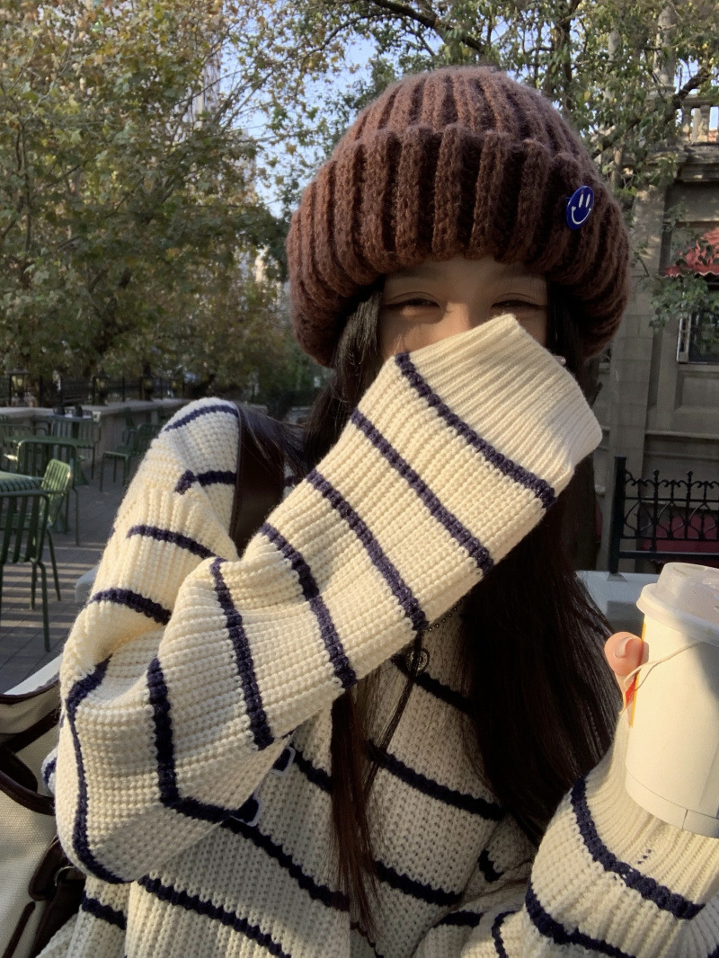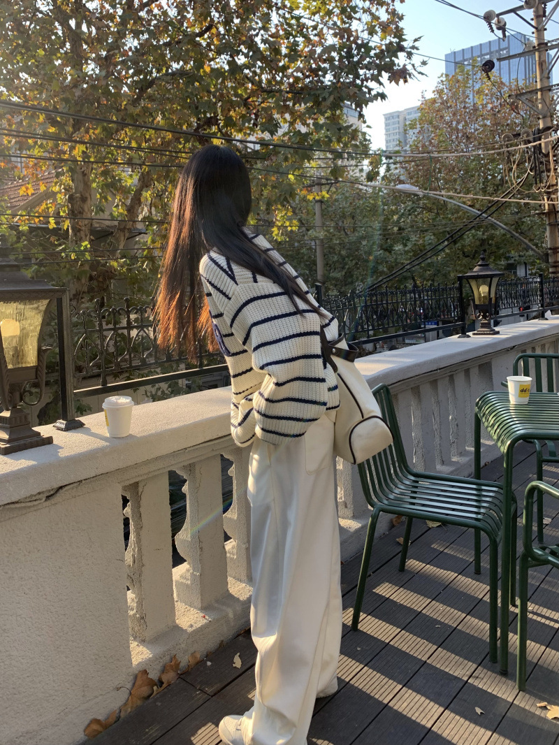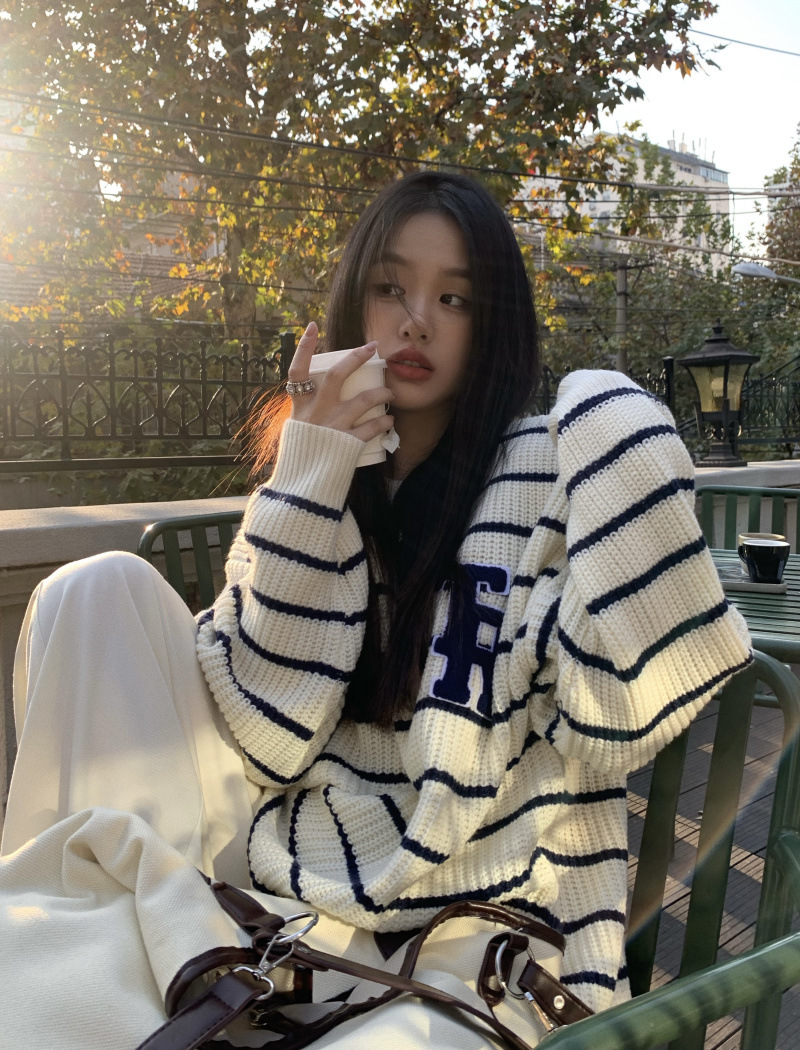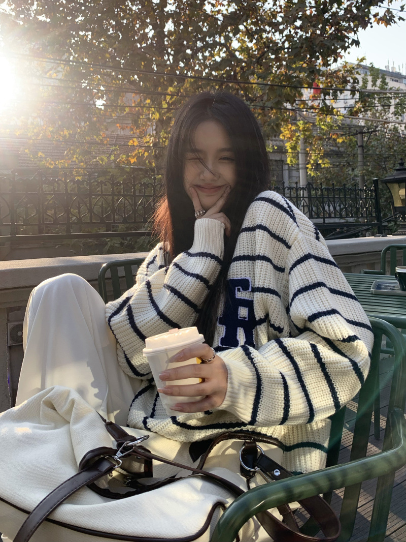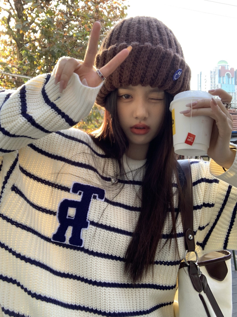 货号:大码刺绣条纹圆领套头毛衣女53