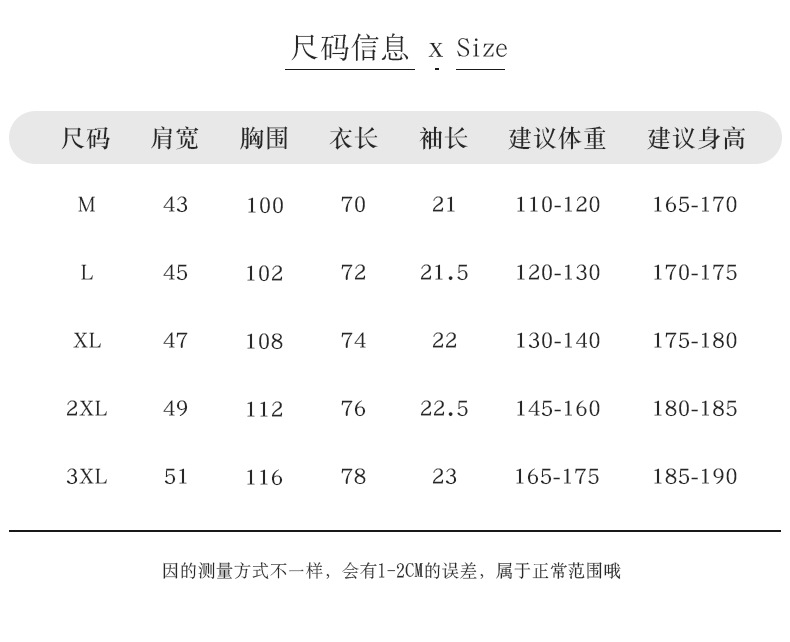 尺码 2XL(185/100A) 3XL(190/104A) L(175/92A) M(170/88A) XL(180/96A)