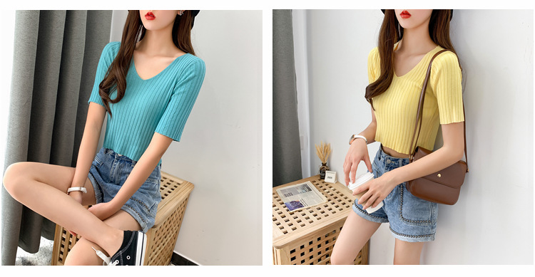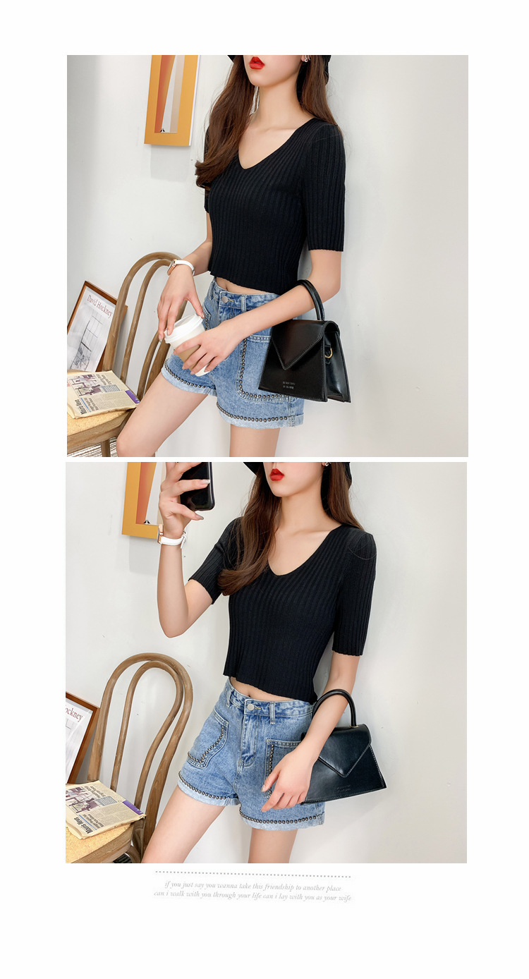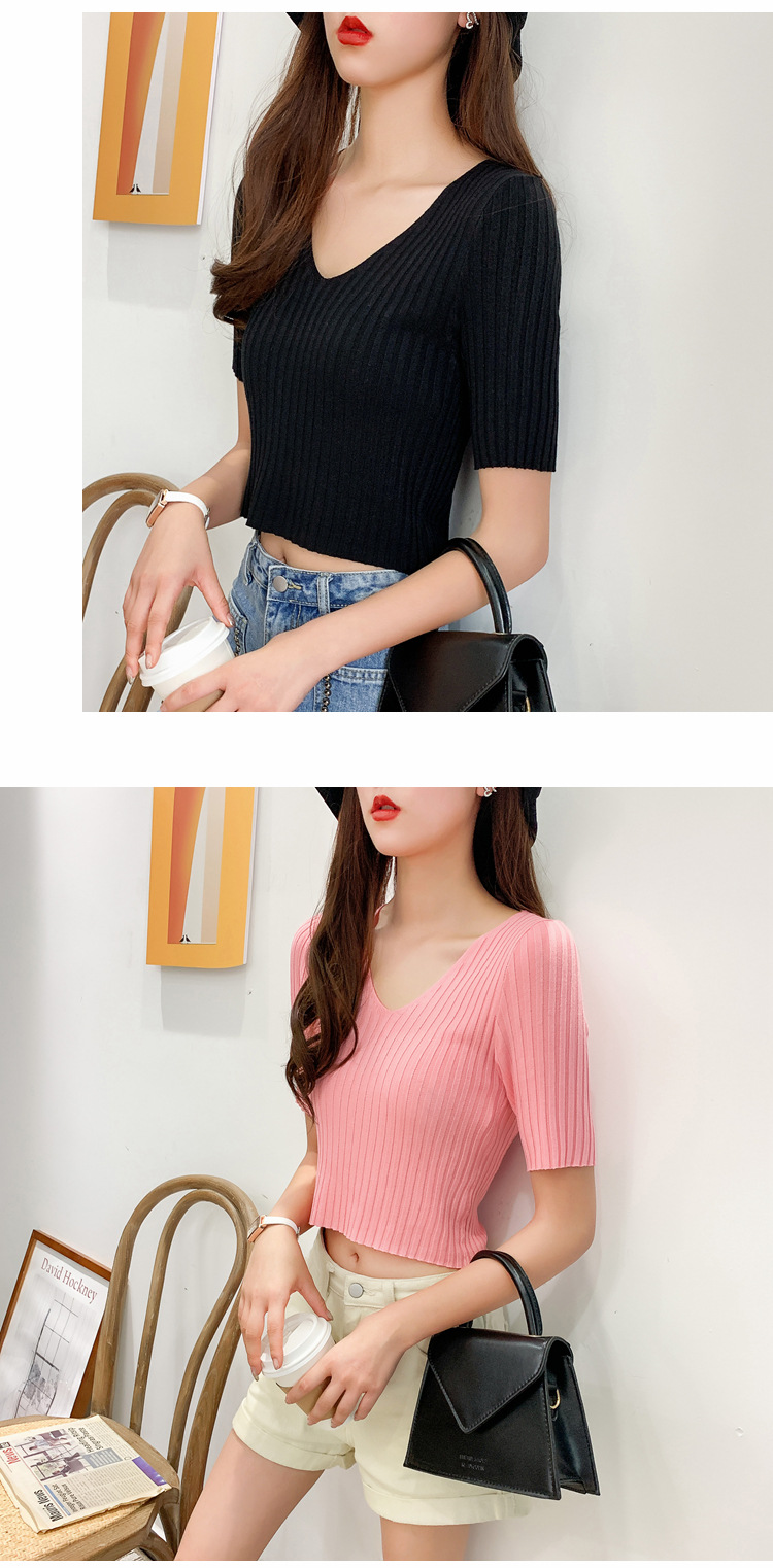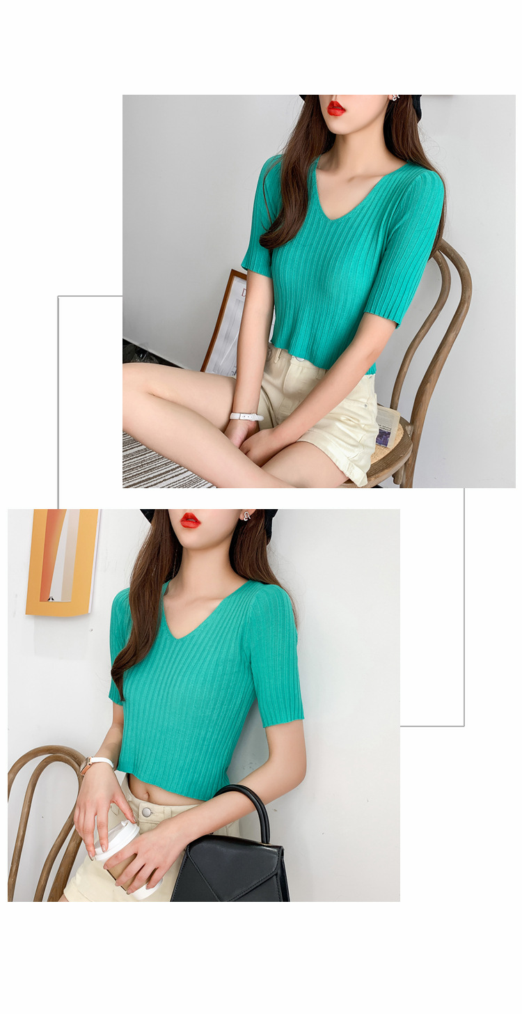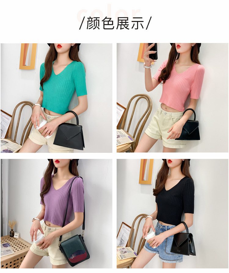 V领显瘦锁骨短款露脐高腰冰丝针织衫