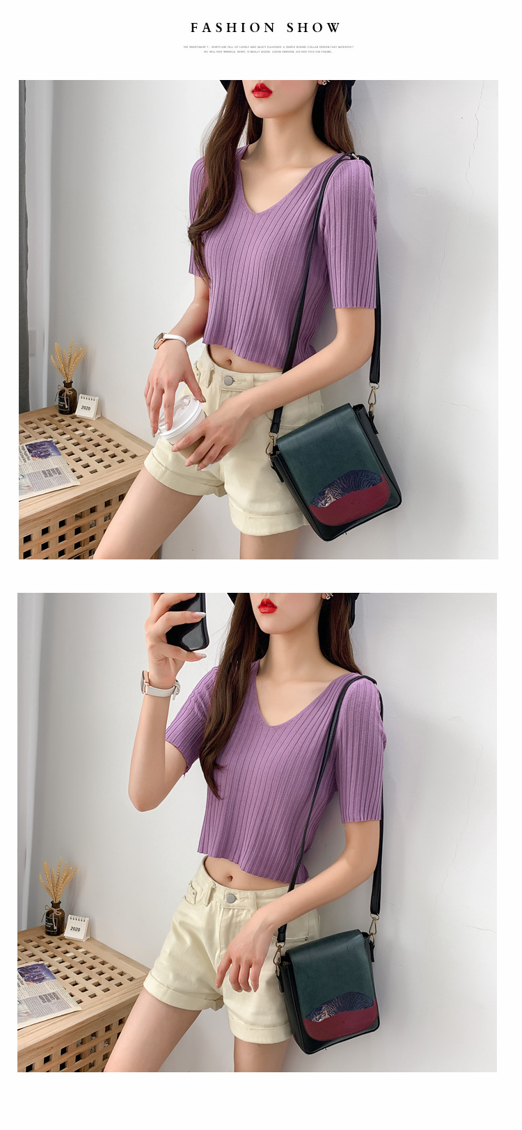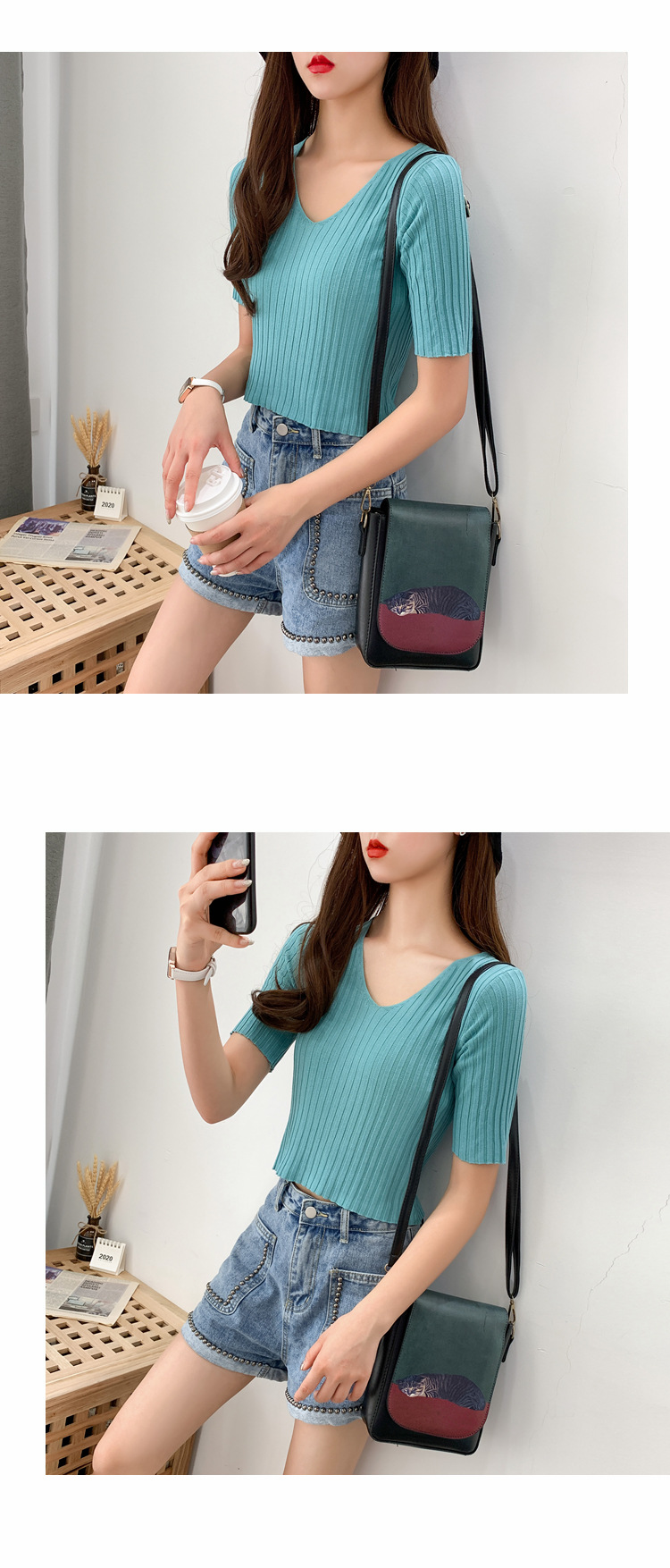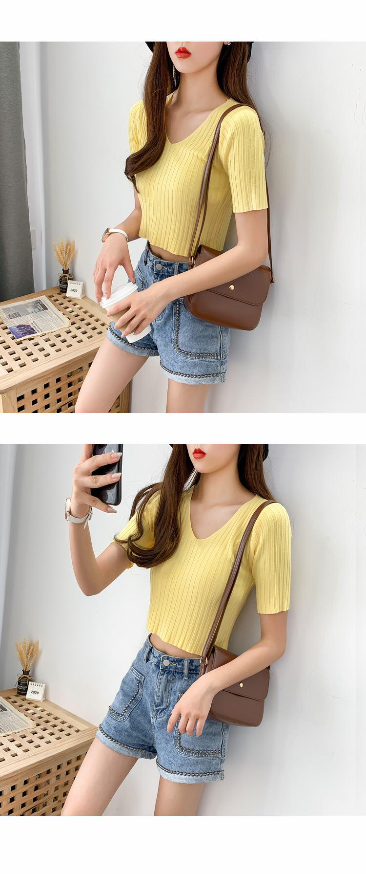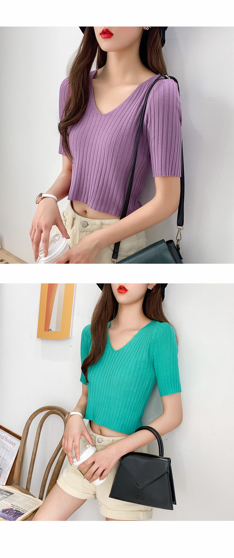 V领显瘦锁骨短款露脐高腰冰丝针织衫