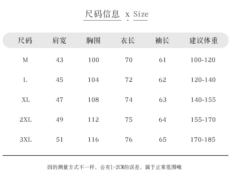 尺码 2XL(185/100A) 3XL(190/104A) L(175/92A) M(170/88A) XL(180/96A)