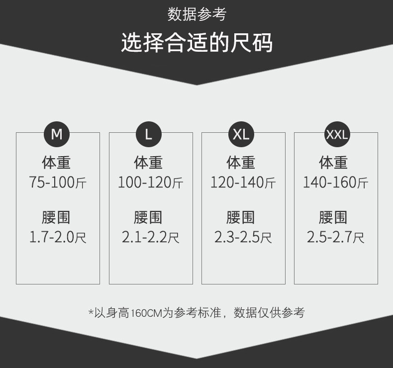 尺码 L腰围2.1_2.2/体重100_120斤 M腰围1.7_2.0/体重75_100斤 XL腰围2.3_2.5/体重120_140斤 XXL腰围2.5_2.7/体重140_160斤