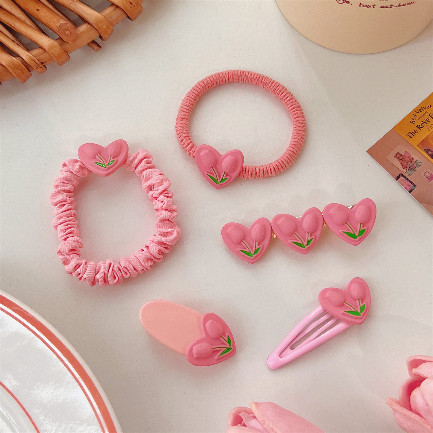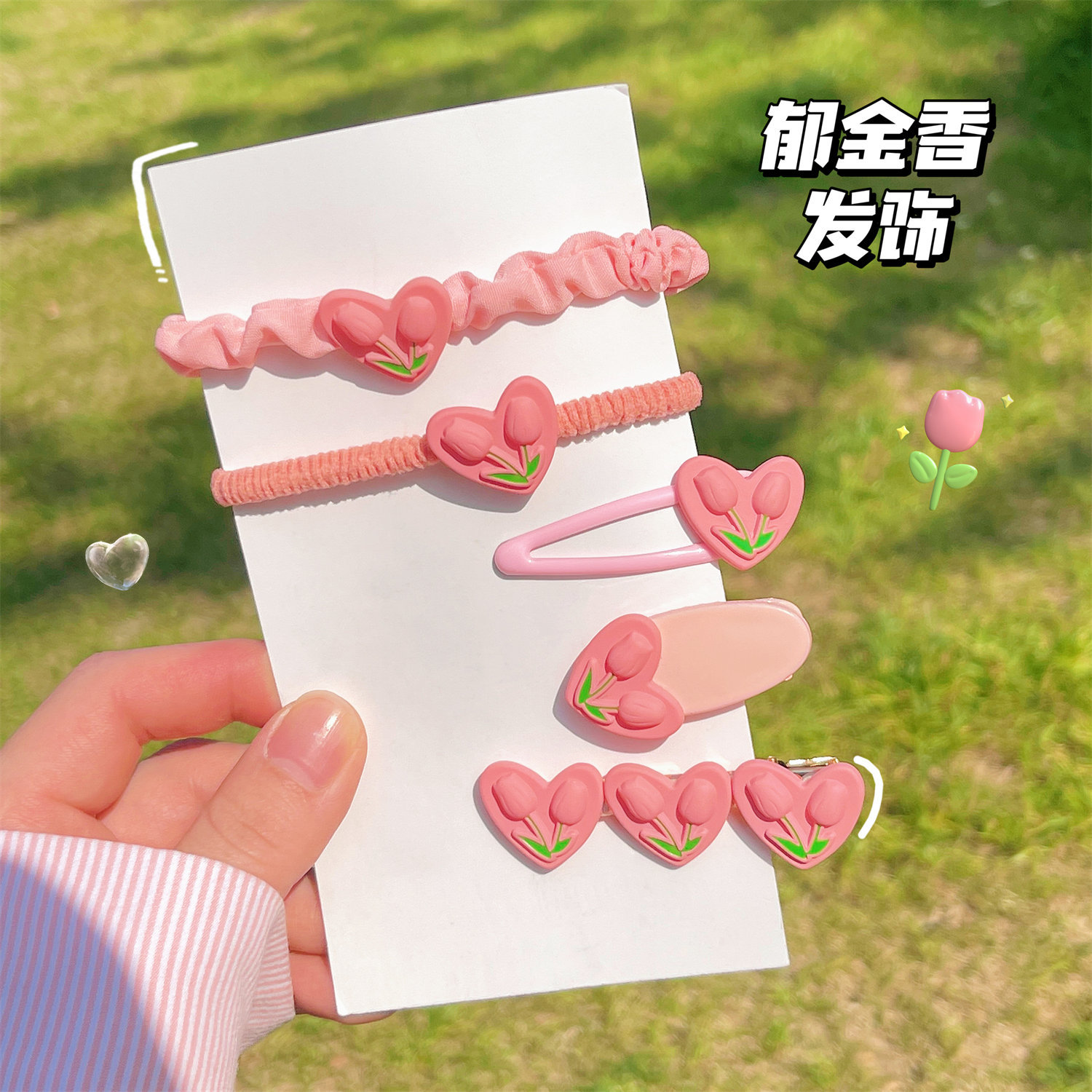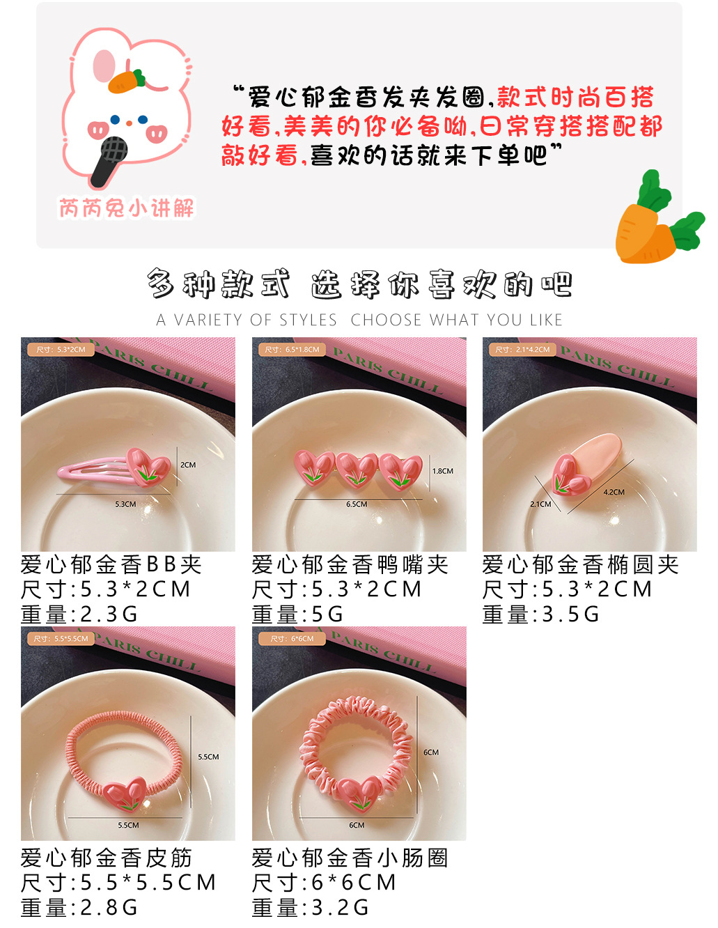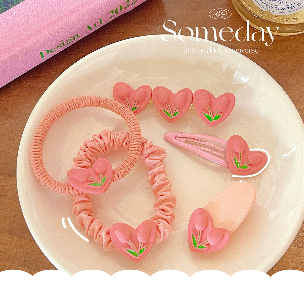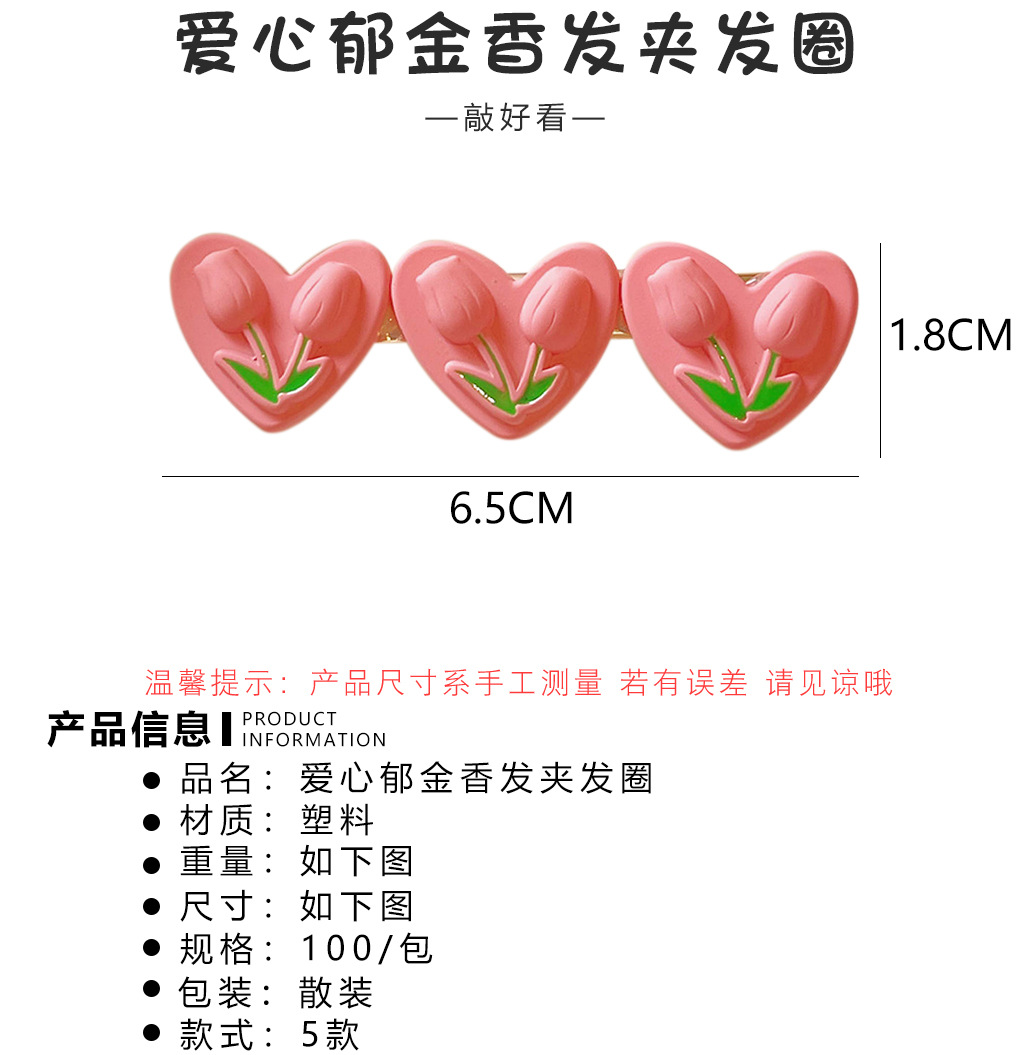 颜色 1#爱心郁金香BB夹 2#爱心郁金香椭圆夹 3#爱心郁金香鸭嘴夹 4#爱心郁金香皮筋 5#爱心郁金香小肠圈