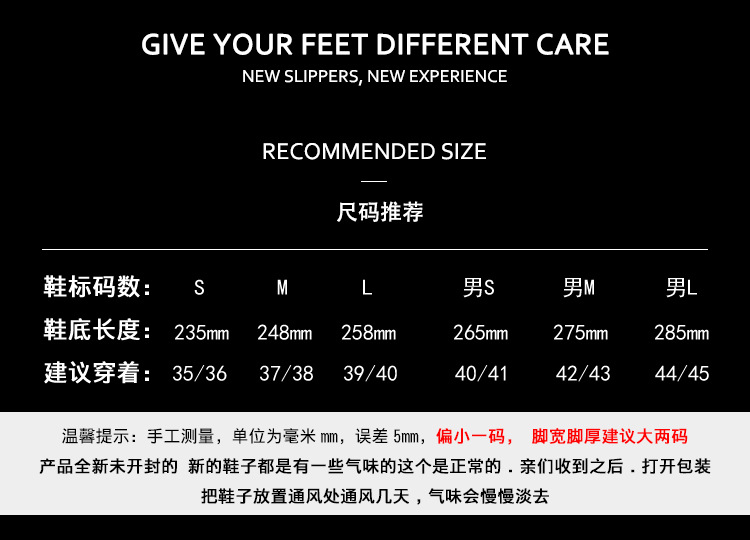 尺码 男:L【建议44_45脚】 男:M【建议42_43脚】 男:S【建议40_41脚】 女:L(建议39_40脚) 女:M(建议37_38脚) 女:S(建议35_36脚)